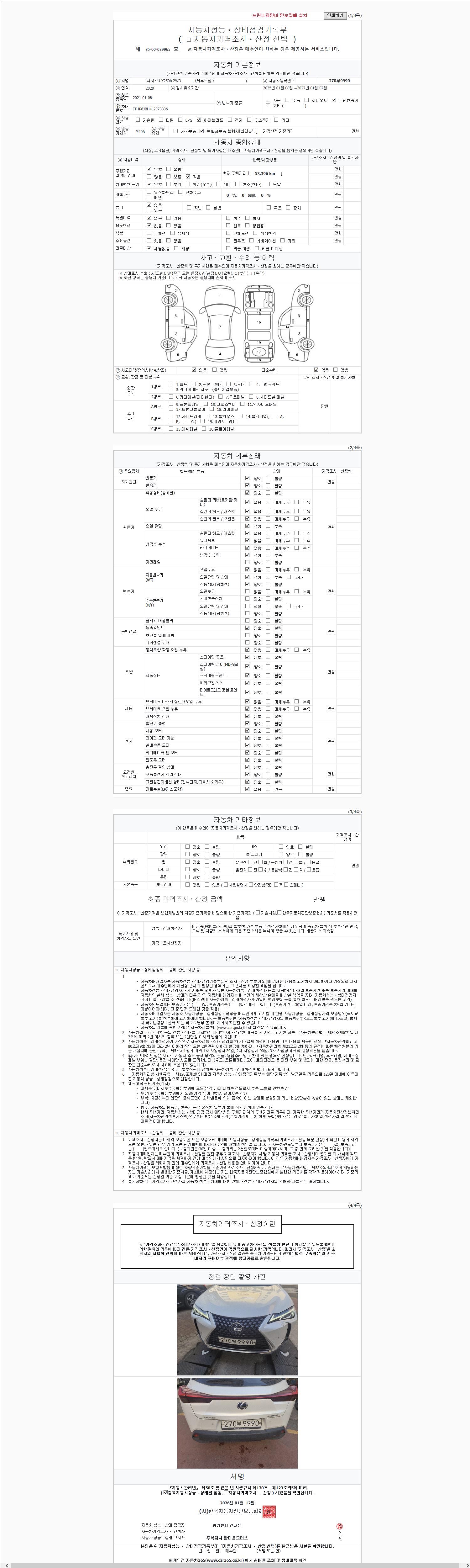 | 주행거리 | 53,396 km | 차량번호 | 270부9990 | 사고유무 | 성능기록부 참조 | 제시번호 | 제 2147483647 호 |