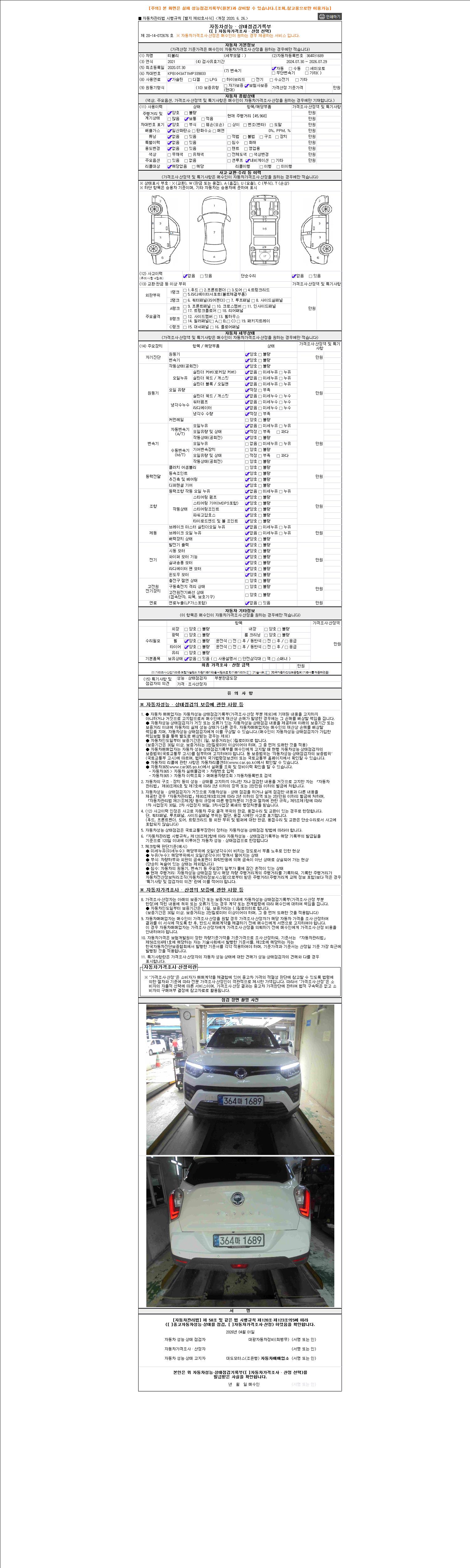 | 주행거리 | 45,968 km | 차량번호 | 364마1689 | 사고유무 | 성능기록부 참조 | 제시번호 | 제 2026041679 호 |