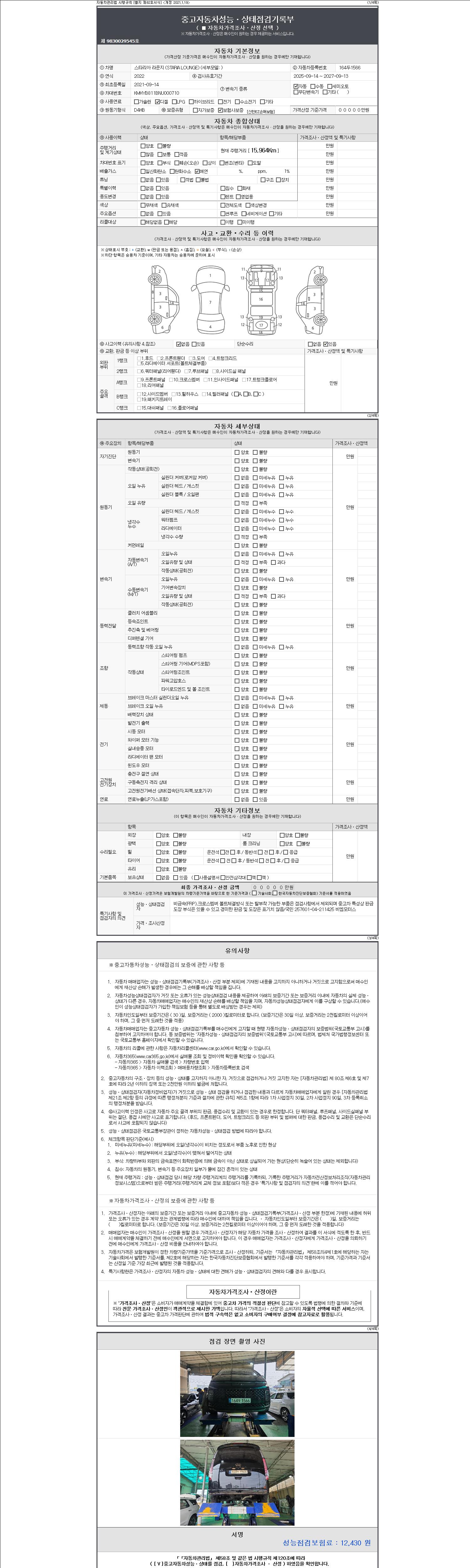 자동차관리법 시행규칙 제120조의 규정에 따라 별지 제 82호서식 《중고자동차 성능, 상태점검 기록부》를 발행한 성능, 상태점검자 및 매매자는 아래의 보증기간 또는 보증거리 이내의 중고자동차, 성능점검 기록부에 기재된 내용과 자동차의 실제 성능, 상태가 다른 경우 계약 또는 관계법령에 따라 매수인에 대하여 책임을 집니다.