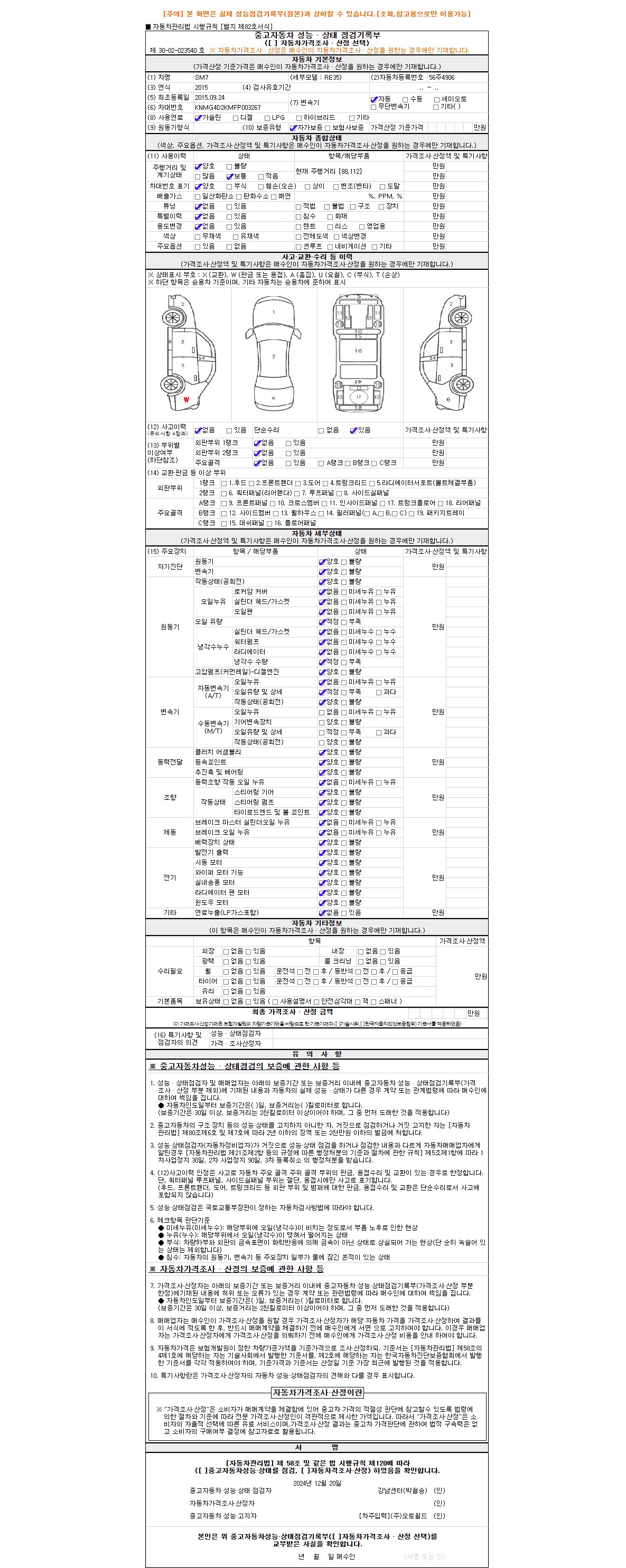 자동차관리법 시행규칙 제120조의 규정에 따라 별지 제 82호서식 《중고자동차 성능, 상태점검 기록부》를 발행한 성능, 상태점검자 및 매매자는 아래의 보증기간 또는 보증거리 이내의 중고자동차, 성능점검 기록부에 기재된 내용과 자동차의 실제 성능, 상태가 다른 경우 계약 또는 관계법령에 따라 매수인에 대하여 책임을 집니다.