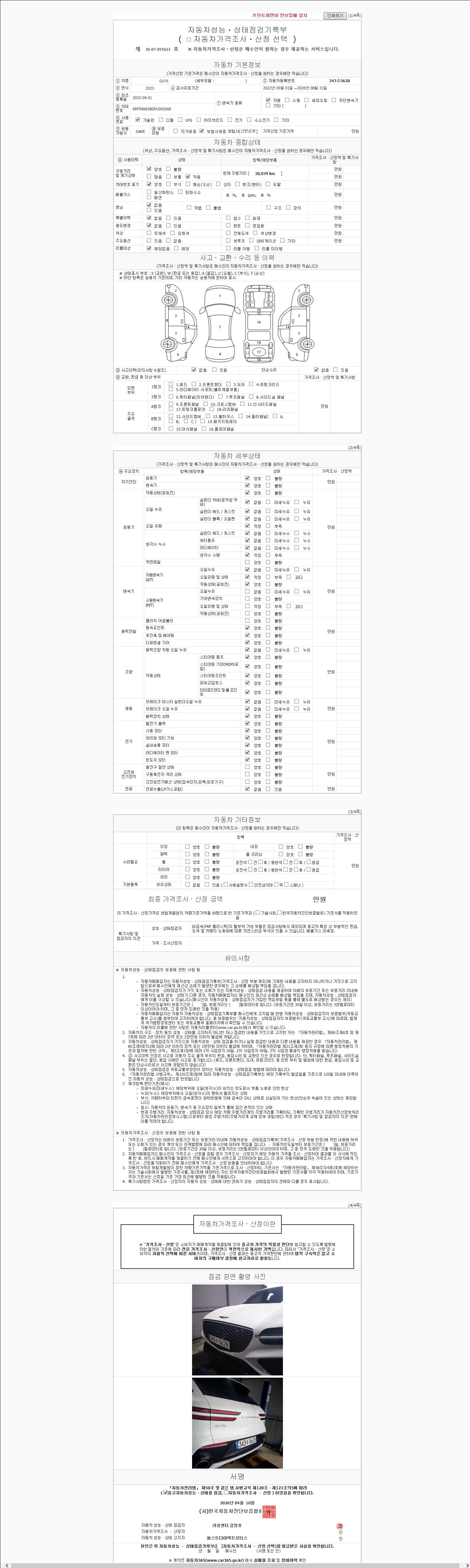 | 주행거리 | 30,039 km | 차량번호 | 343수5628 | 사고유무 | 성능기록부 참조 | 제시번호 | 제 2147483647 호 |