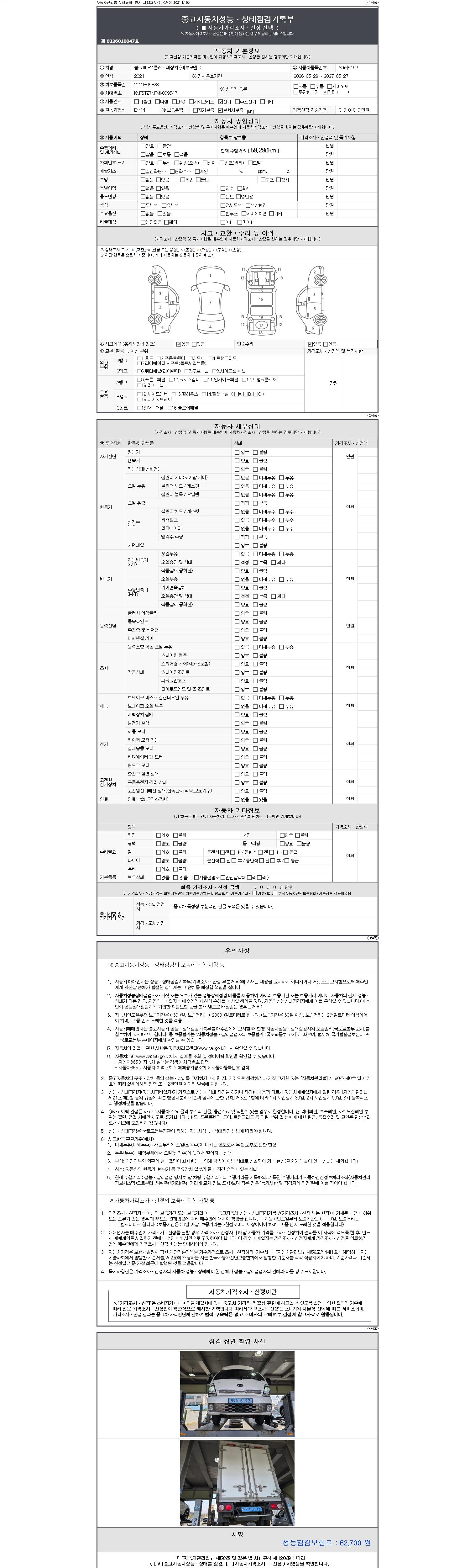| 주행거리 | 59,290 km | 차량번호 | 89러5192 | 사고유무 | 성능기록부 참조 | 제시번호 | 제 2147483647 호 |