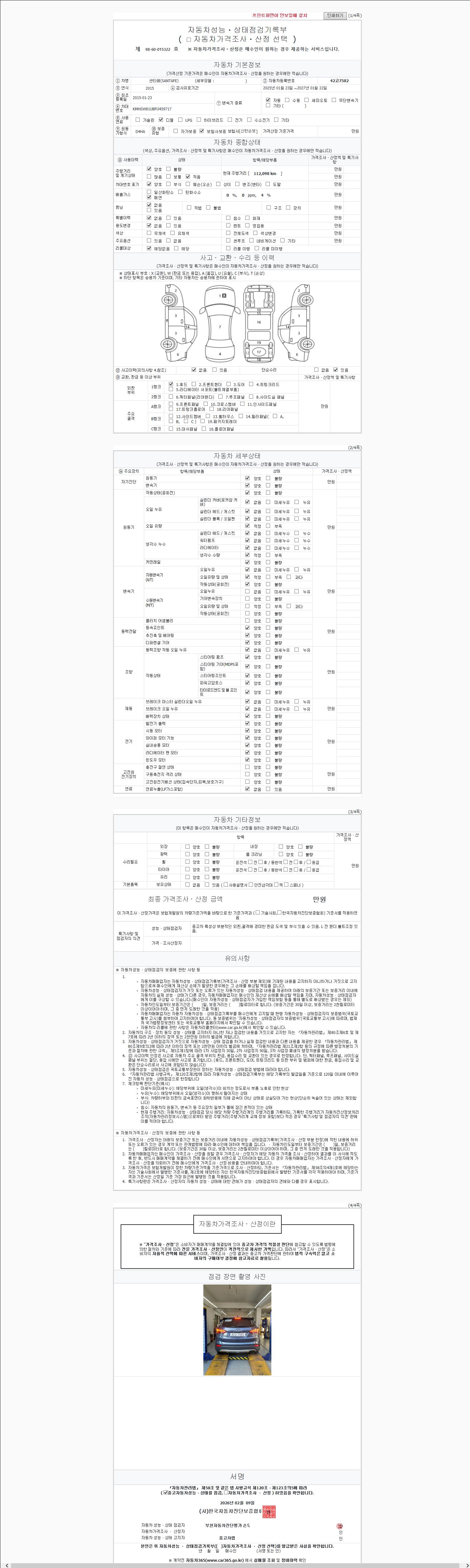 | 주행거리 | 112,098 km | 차량번호 | 42고7582 | 사고유무 | 성능기록부 참조 | 제시번호 | 제 2026025105 호 |