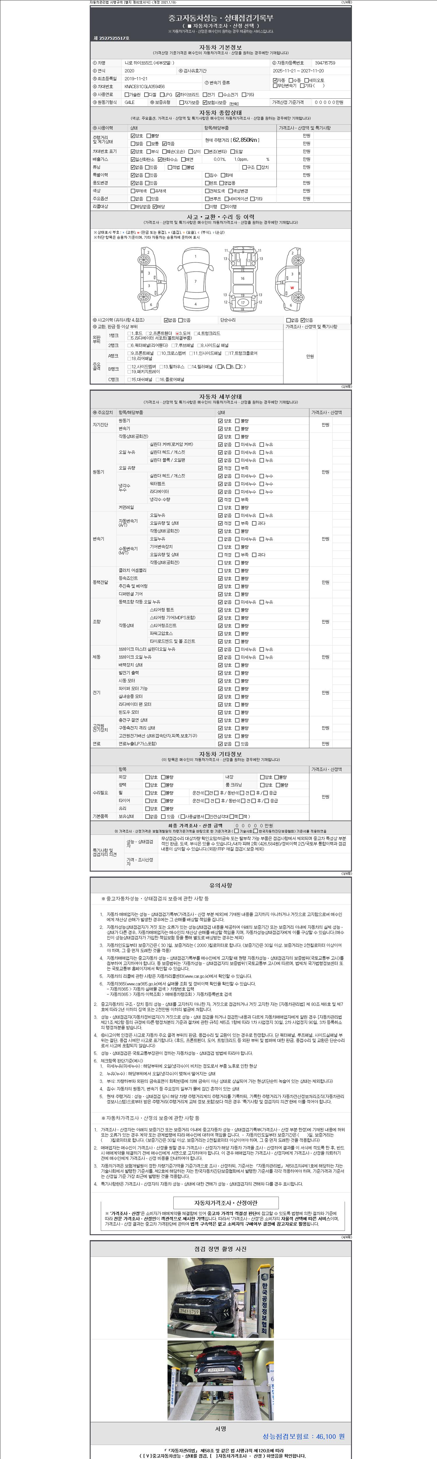 자동차관리법 시행규칙 제120조의 규정에 따라 별지 제 82호서식 《중고자동차 성능, 상태점검 기록부》를 발행한 성능, 상태점검자 및 매매자는 아래의 보증기간 또는 보증거리 이내의 중고자동차, 성능점검 기록부에 기재된 내용과 자동차의 실제 성능, 상태가 다른 경우 계약 또는 관계법령에 따라 매수인에 대하여 책임을 집니다.