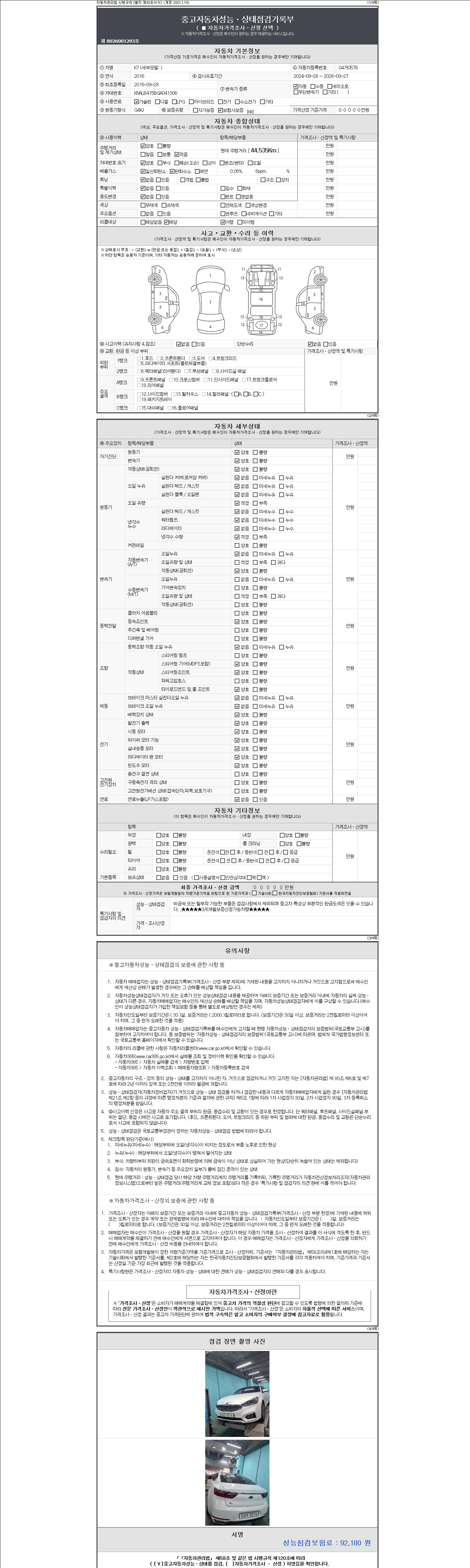 자동차관리법 시행규칙 제120조의 규정에 따라 별지 제 82호서식 《중고자동차 성능, 상태점검 기록부》를 발행한 성능, 상태점검자 및 매매자는 아래의 보증기간 또는 보증거리 이내의 중고자동차, 성능점검 기록부에 기재된 내용과 자동차의 실제 성능, 상태가 다른 경우 계약 또는 관계법령에 따라 매수인에 대하여 책임을 집니다.