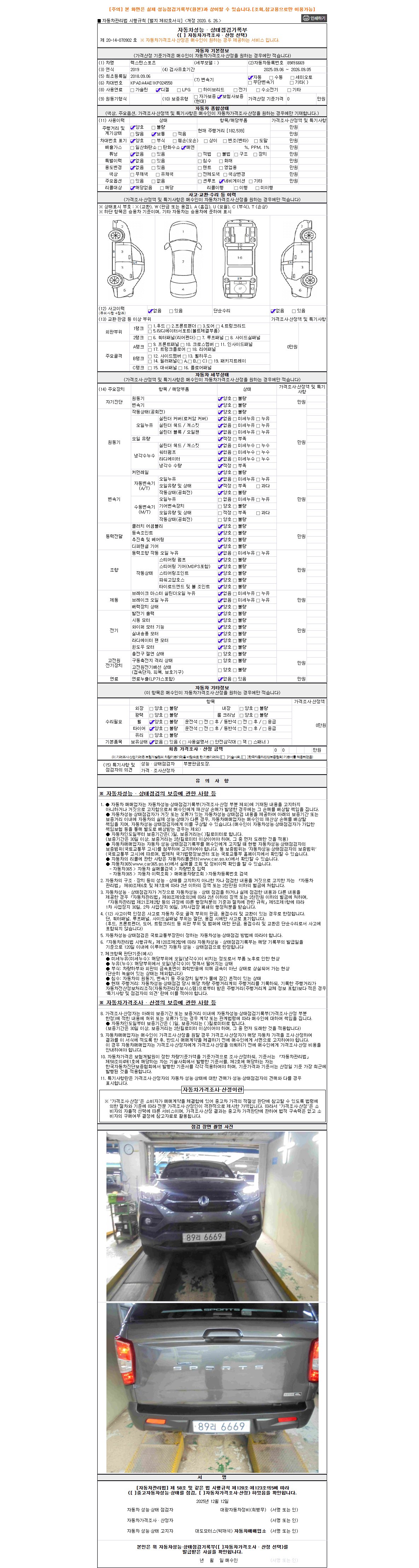 자동차관리법 시행규칙 제120조의 규정에 따라 별지 제 82호서식 《중고자동차 성능, 상태점검 기록부》를 발행한 성능, 상태점검자 및 매매자는 아래의 보증기간 또는 보증거리 이내의 중고자동차, 성능점검 기록부에 기재된 내용과 자동차의 실제 성능, 상태가 다른 경우 계약 또는 관계법령에 따라 매수인에 대하여 책임을 집니다.