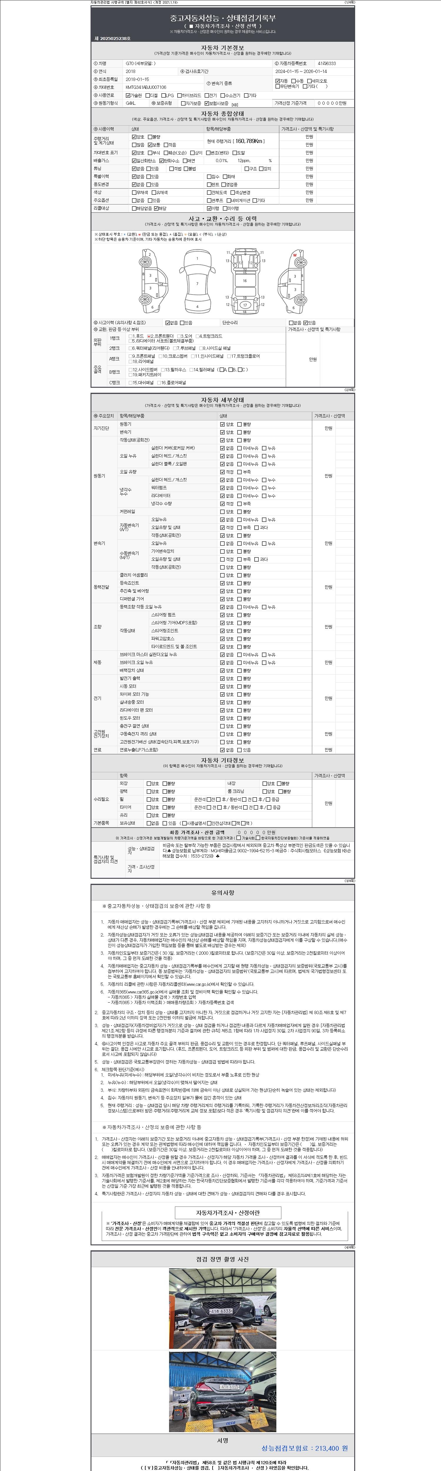 | 주행거리 | 160,789 km | 차량번호 | 41라6333 | 사고유무 | 성능기록부 참조 | 제시번호 | 제 2147483647 호 |