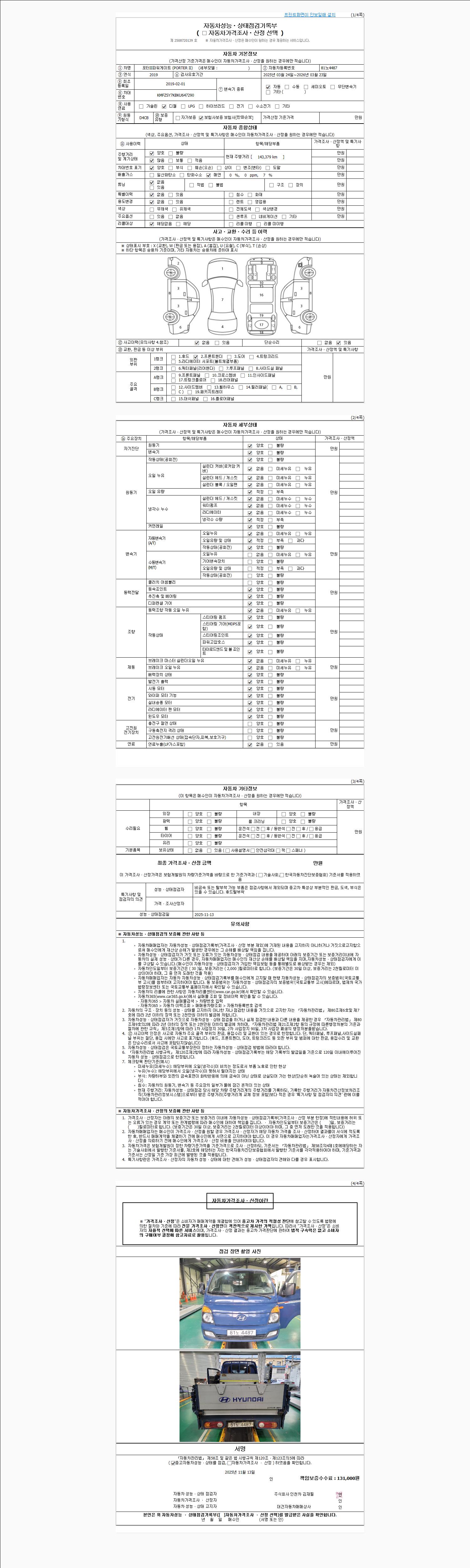 | 주행거리 | 143,379 km | 차량번호 | 81노4487 | 사고유무 | 성능기록부 참조 | 제시번호 | 제 2025062511 호 |