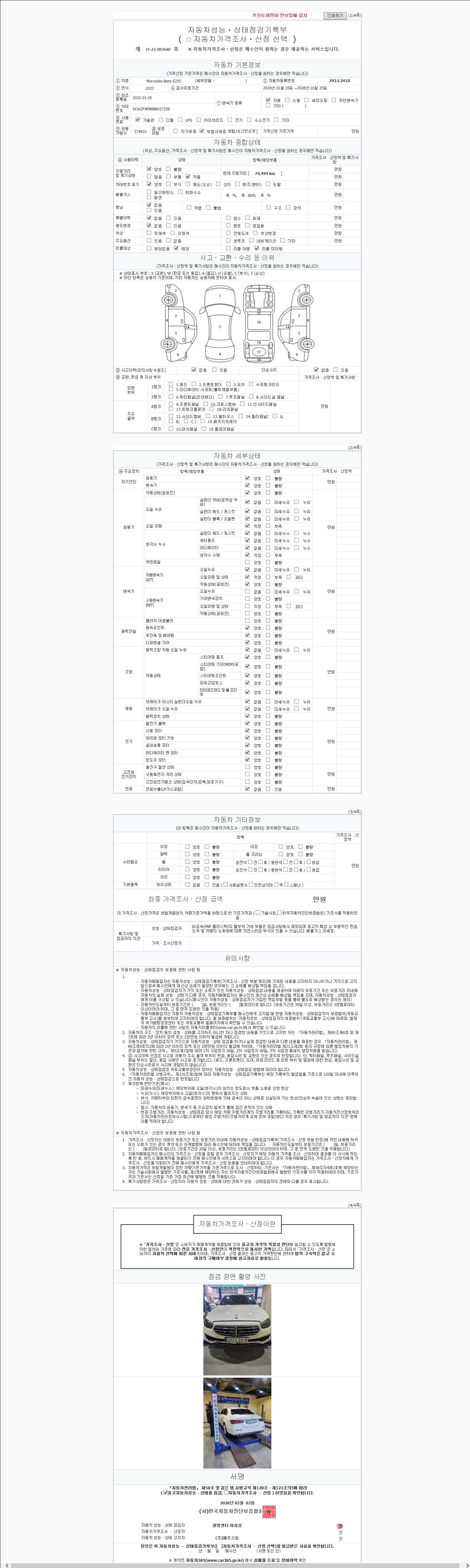 | 주행거리 | 74,475 km | 차량번호 | 292소2418 | 사고유무 | 성능기록부 참조 | 제시번호 | 제 2147483647 호 |
