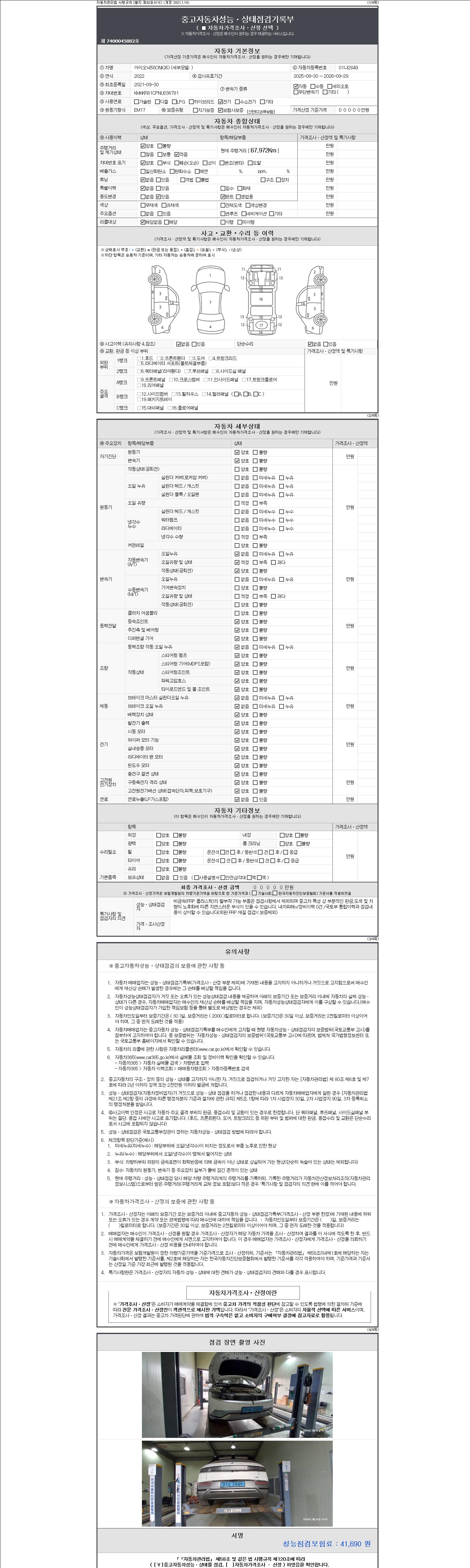 자동차관리법 시행규칙 제120조의 규정에 따라 별지 제 82호서식 《중고자동차 성능, 상태점검 기록부》를 발행한 성능, 상태점검자 및 매매자는 아래의 보증기간 또는 보증거리 이내의 중고자동차, 성능점검 기록부에 기재된 내용과 자동차의 실제 성능, 상태가 다른 경우 계약 또는 관계법령에 따라 매수인에 대하여 책임을 집니다.