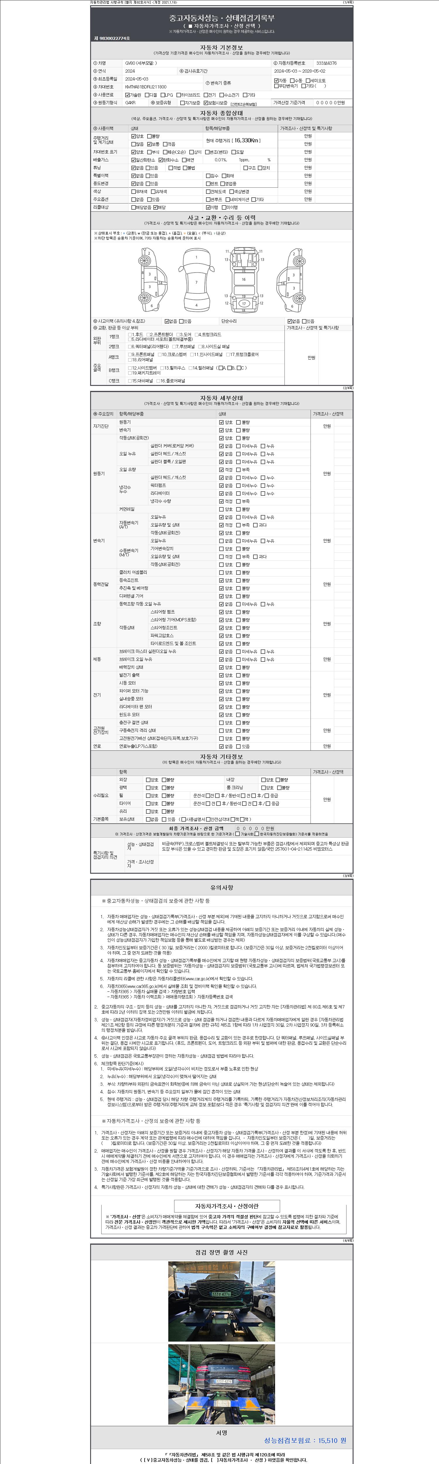 자동차관리법 시행규칙 제120조의 규정에 따라 별지 제 82호서식 《중고자동차 성능, 상태점검 기록부》를 발행한 성능, 상태점검자 및 매매자는 아래의 보증기간 또는 보증거리 이내의 중고자동차, 성능점검 기록부에 기재된 내용과 자동차의 실제 성능, 상태가 다른 경우 계약 또는 관계법령에 따라 매수인에 대하여 책임을 집니다.