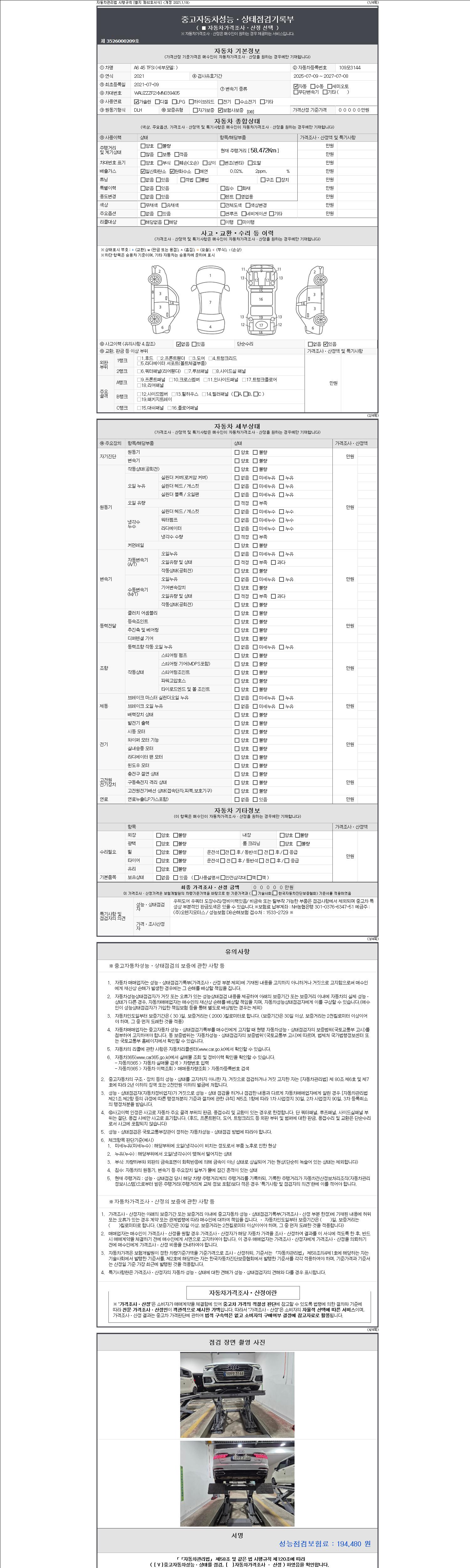 -중고자동차 매매업자를 통해 차량을 구입하실 경우 반드시 "중고자동차 성능, 상태점검 기록부"를 교뷰 받으셔야 하며, 매매업자는 반드시 의무 교부 하여야 압니다.