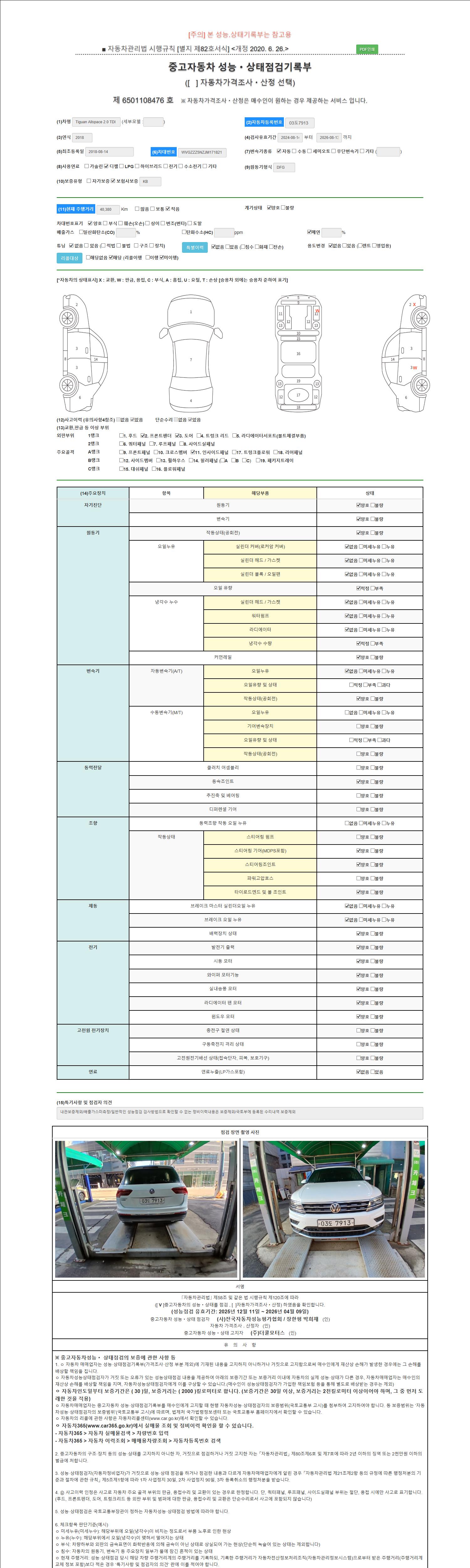 자동차관리법 시행규칙 제120조의 규정에 따라 별지 제 82호서식 《중고자동차 성능, 상태점검 기록부》를 발행한 성능, 상태점검자 및 매매자는 아래의 보증기간 또는 보증거리 이내의 중고자동차, 성능점검 기록부에 기재된 내용과 자동차의 실제 성능, 상태가 다른 경우 계약 또는 관계법령에 따라 매수인에 대하여 책임을 집니다.