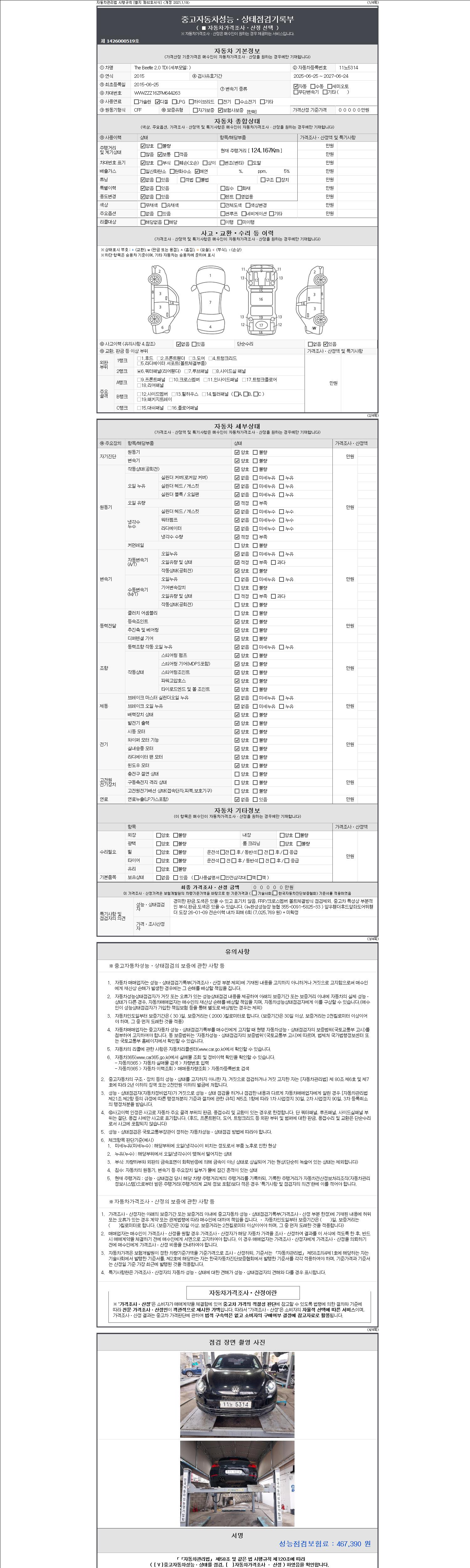 -중고자동차 매매업자를 통해 차량을 구입하실 경우 반드시 "중고자동차 성능, 상태점검 기록부"를 교뷰 받으셔야 하며, 매매업자는 반드시 의무 교부 하여야 압니다.