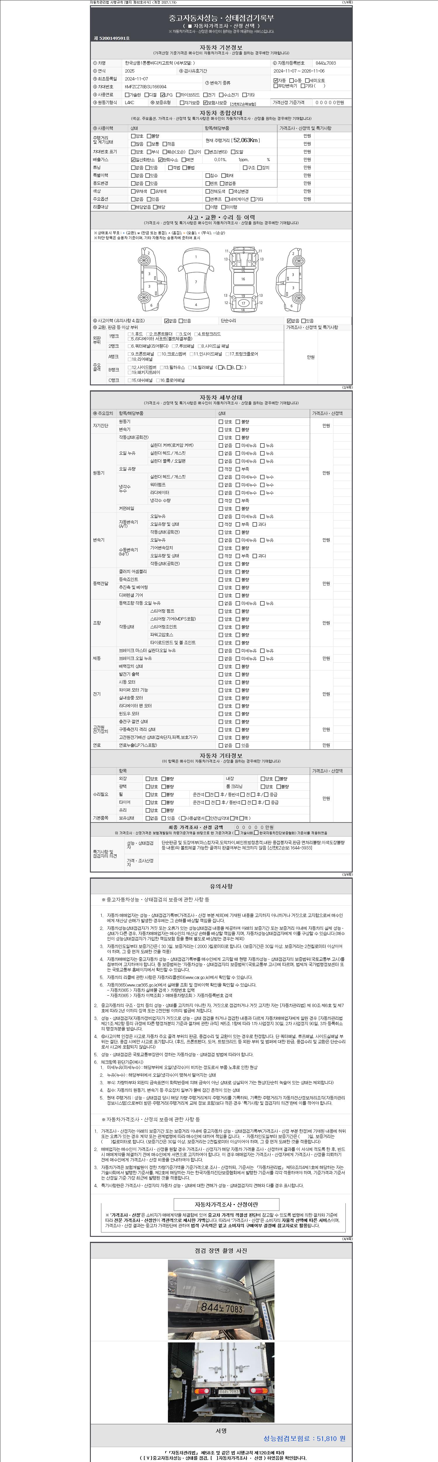 | 주행거리 | 52,063 km | 차량번호 | 844노7083 | 사고유무 | 성능기록부 참조 | 제시번호 | 제 2147483647 호 |