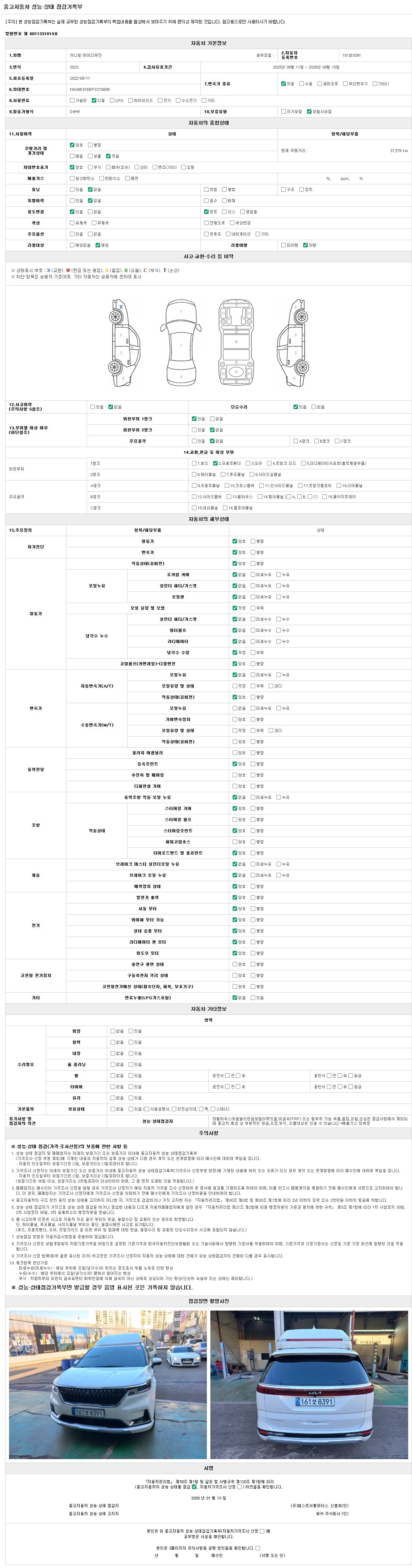 | 주행거리 | 31,576 km | 차량번호 | 161보8391 | 사고유무 | 성능기록부 참조 | 제시번호 | 제 2026001417 호 |