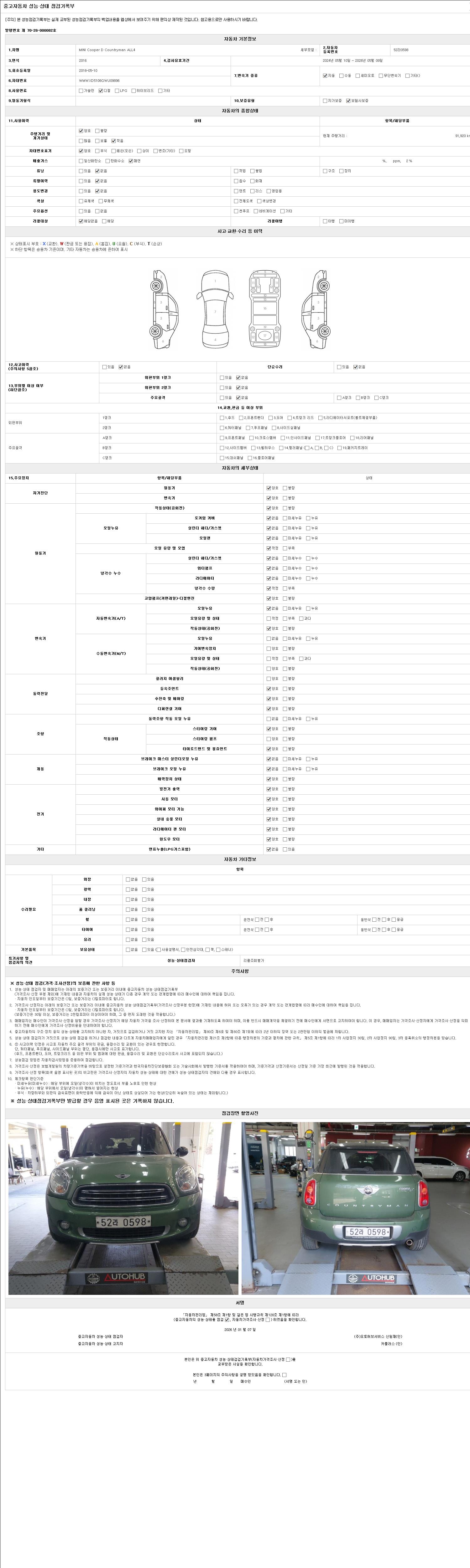 자동차관리법 시행규칙 제120조의 규정에 따라 별지 제 82호서식 《중고자동차 성능, 상태점검 기록부》를 발행한 성능, 상태점검자 및 매매자는 아래의 보증기간 또는 보증거리 이내의 중고자동차, 성능점검 기록부에 기재된 내용과 자동차의 실제 성능, 상태가 다른 경우 계약 또는 관계법령에 따라 매수인에 대하여 책임을 집니다.