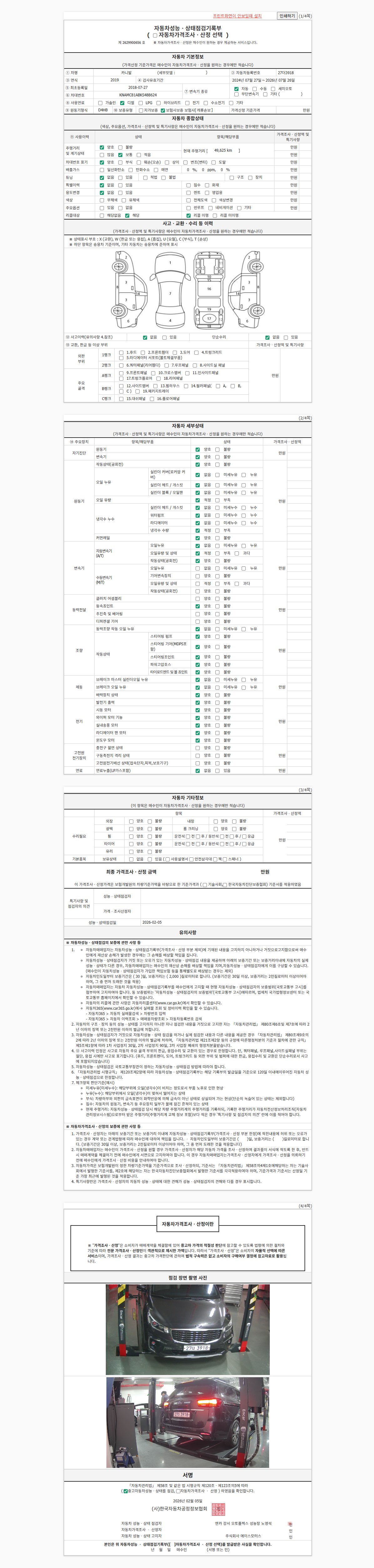 | 주행거리 | 49,627 km | 차량번호 | 27더3918 | 사고유무 | 성능기록부 참조 | 제시번호 | 제 2026010155 호 |