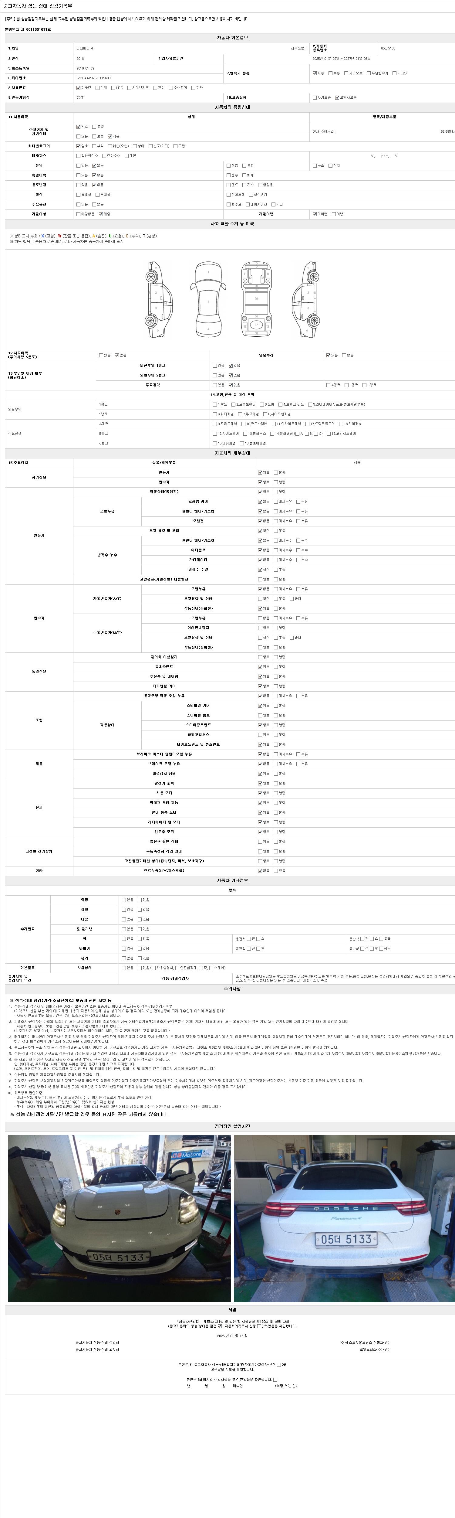 | 주행거리 | 62,895 km | 차량번호 | 05더5133 | 사고유무 | 성능기록부 참조 | 제시번호 | 제 2026001260 호 |