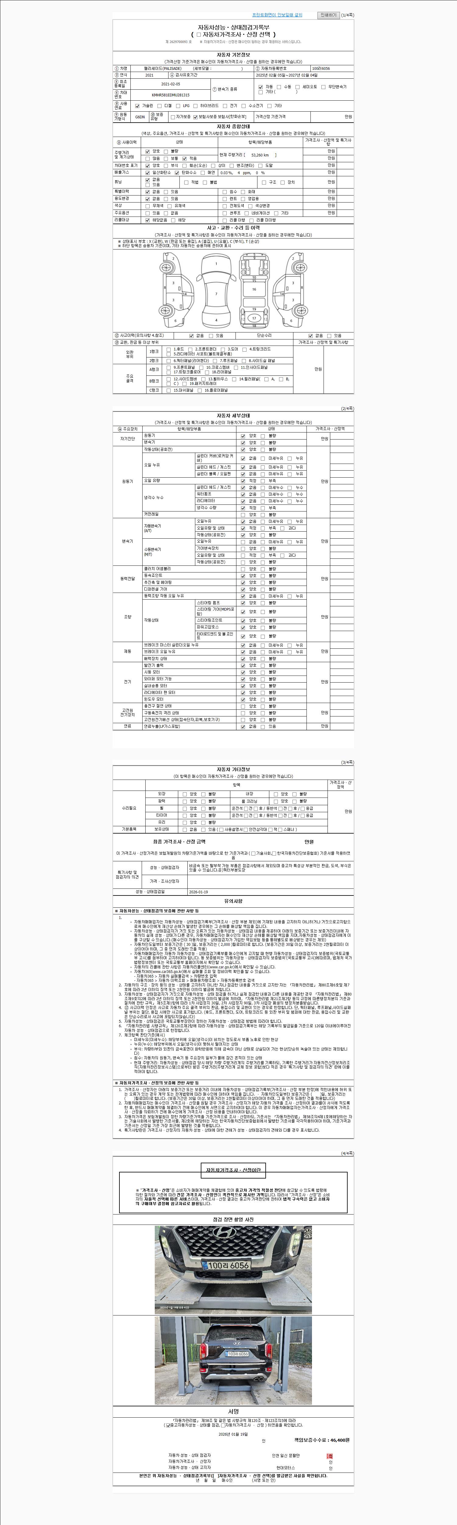 | 주행거리 | 53,260 km | 차량번호 | 100러6056 | 사고유무 | 성능기록부 참조 | 제시번호 | 제 2026003397 호 |