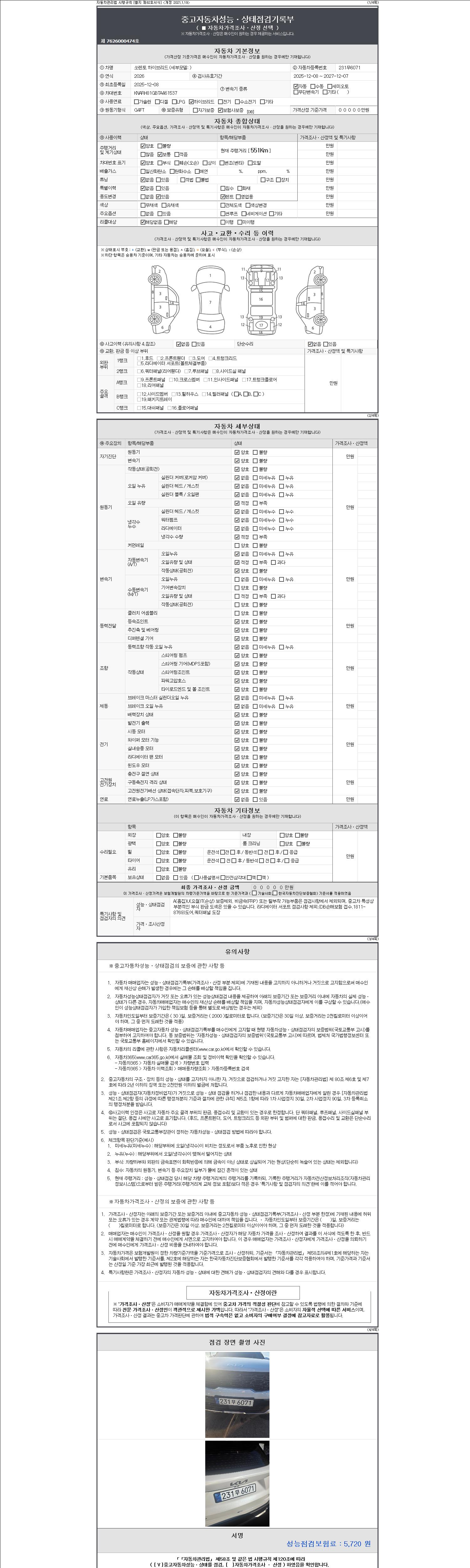 | 주행거리 | 551 km | 차량번호 | 231무6071 | 사고유무 | 성능기록부 참조 | 제시번호 | 제 2147483647 호 |
