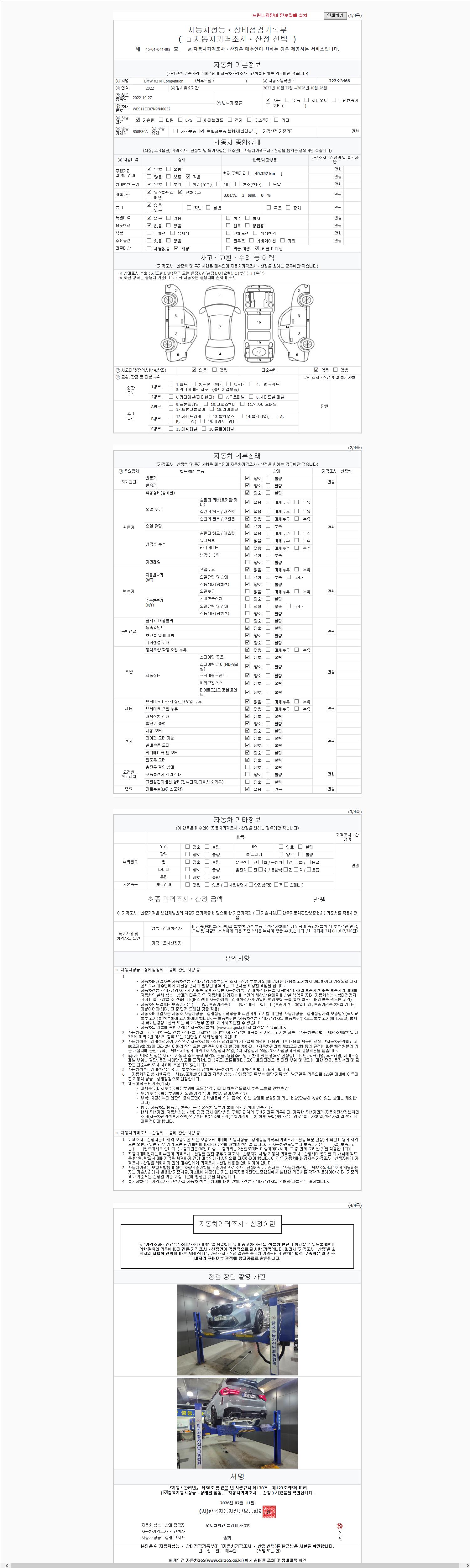 자동차관리법 시행규칙 제120조의 규정에 따라 별지 제 82호서식 《중고자동차 성능, 상태점검 기록부》를 발행한 성능, 상태점검자 및 매매자는 아래의 보증기간 또는 보증거리 이내의 중고자동차, 성능점검 기록부에 기재된 내용과 자동차의 실제 성능, 상태가 다른 경우 계약 또는 관계법령에 따라 매수인에 대하여 책임을 집니다.