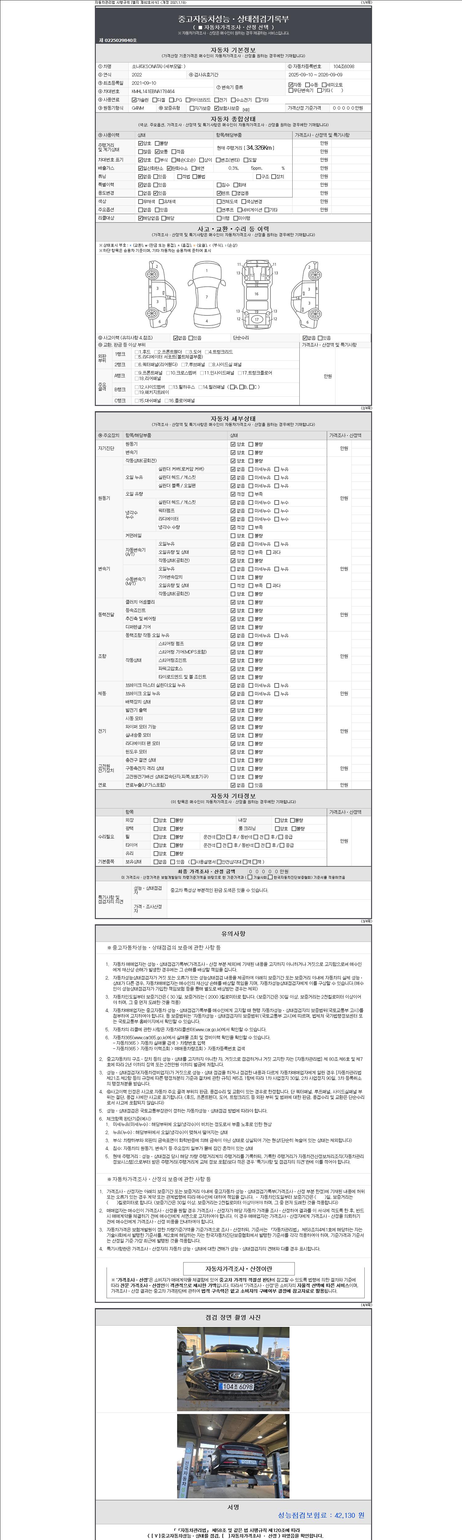 | 주행거리 | 34,308 km | 차량번호 | 104조6098 | 사고유무 | 성능기록부 참조 | 제시번호 | 제 2147483647 호 |