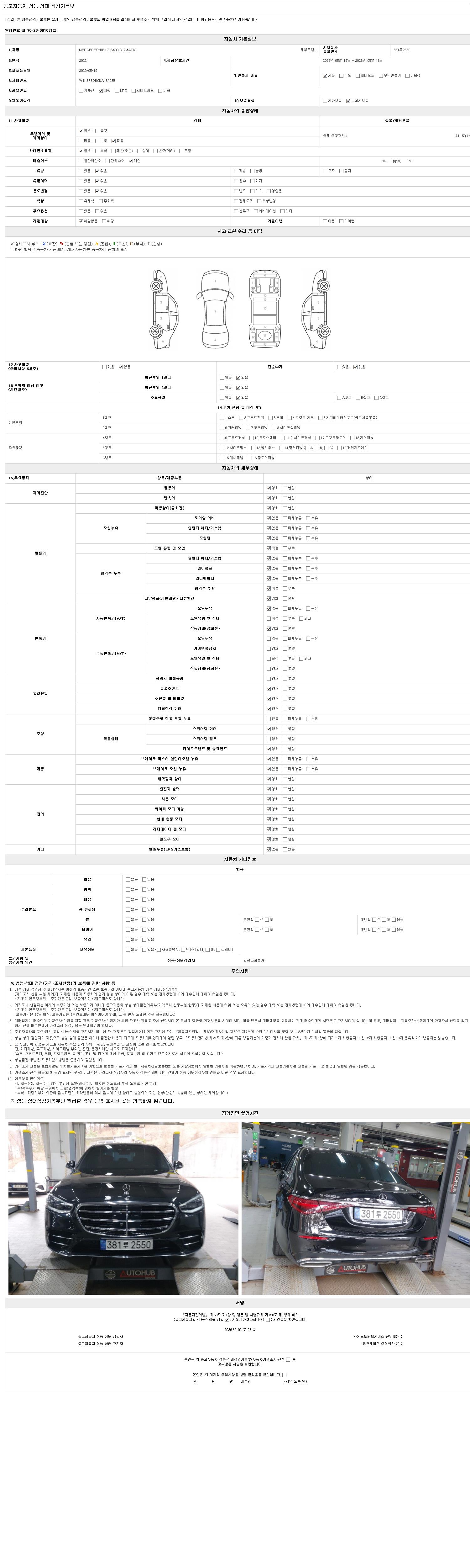 자동차관리법 시행규칙 제120조의 규정에 따라 별지 제 82호서식 《중고자동차 성능, 상태점검 기록부》를 발행한 성능, 상태점검자 및 매매자는 아래의 보증기간 또는 보증거리 이내의 중고자동차, 성능점검 기록부에 기재된 내용과 자동차의 실제 성능, 상태가 다른 경우 계약 또는 관계법령에 따라 매수인에 대하여 책임을 집니다.