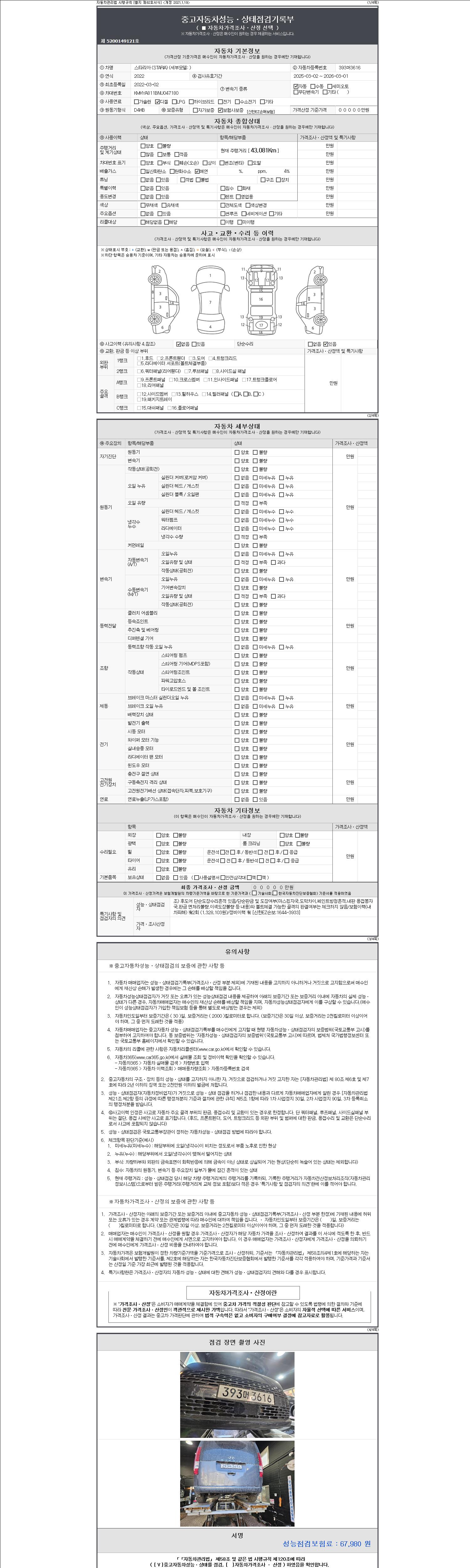 | 주행거리 | 43,081 km | 차량번호 | 393머3616 | 사고유무 | 성능기록부 참조 | 제시번호 | 제 2147483647 호 |