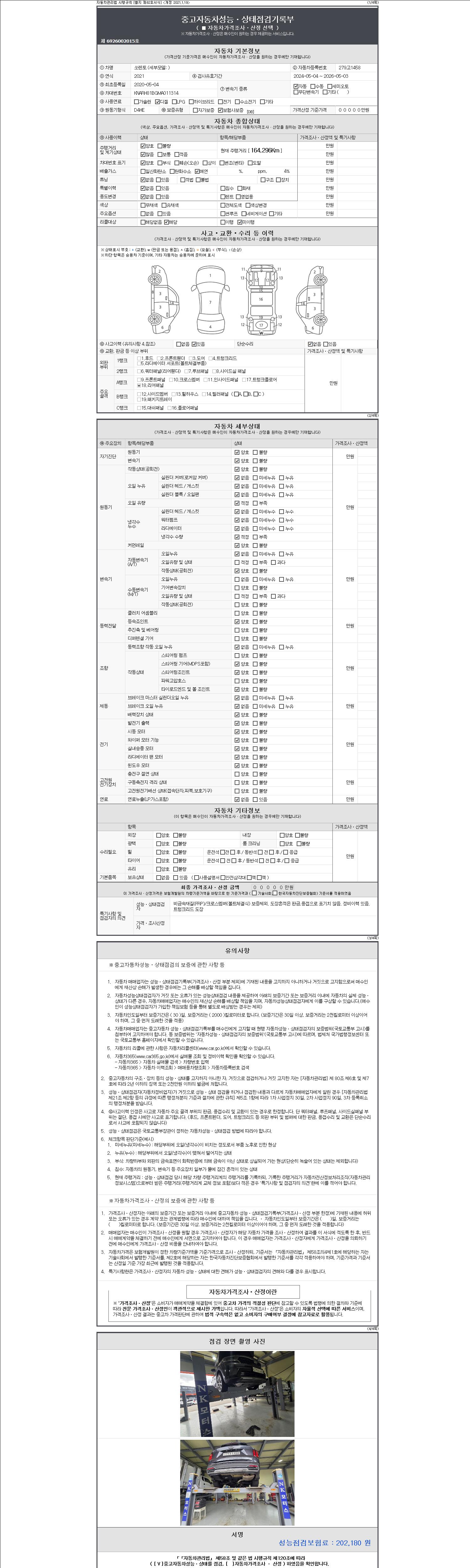 자동차관리법 시행규칙 제120조의 규정에 따라 별지 제 82호서식 《중고자동차 성능, 상태점검 기록부》를 발행한 성능, 상태점검자 및 매매자는 아래의 보증기간 또는 보증거리 이내의 중고자동차, 성능점검 기록부에 기재된 내용과 자동차의 실제 성능, 상태가 다른 경우 계약 또는 관계법령에 따라 매수인에 대하여 책임을 집니다.