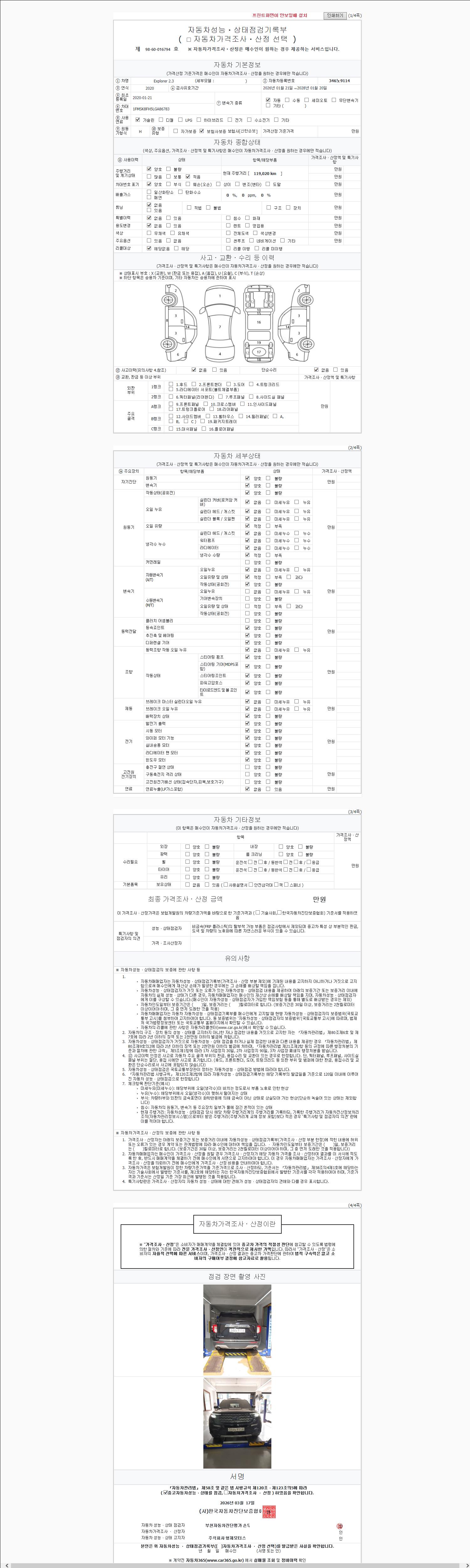 | 주행거리 | 119,020 km | 차량번호 | 346노9114 | 사고유무 | 성능기록부 참조 | 제시번호 | 제 2026049565 호 |
