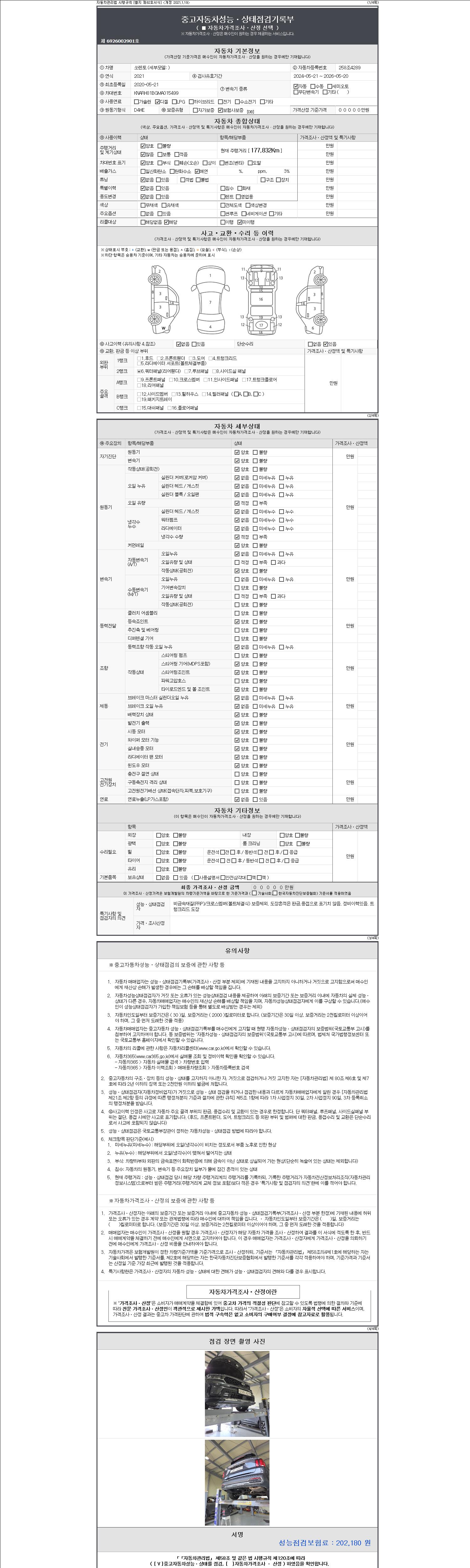 | 주행거리 | 177,832 km | 차량번호 | 258조4289 | 사고유무 | 성능기록부 참조 | 제시번호 | 제 2147483647 호 |