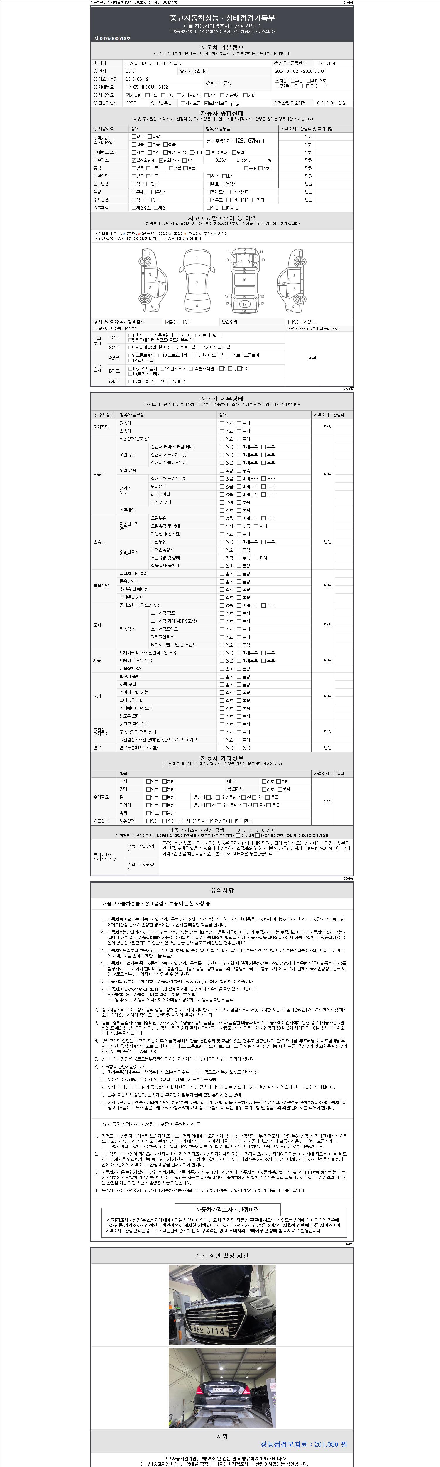 | 주행거리 | 123,167 km | 차량번호 | 46오0114 | 사고유무 | 성능기록부 참조 | 제시번호 | 제 2147483647 호 |
