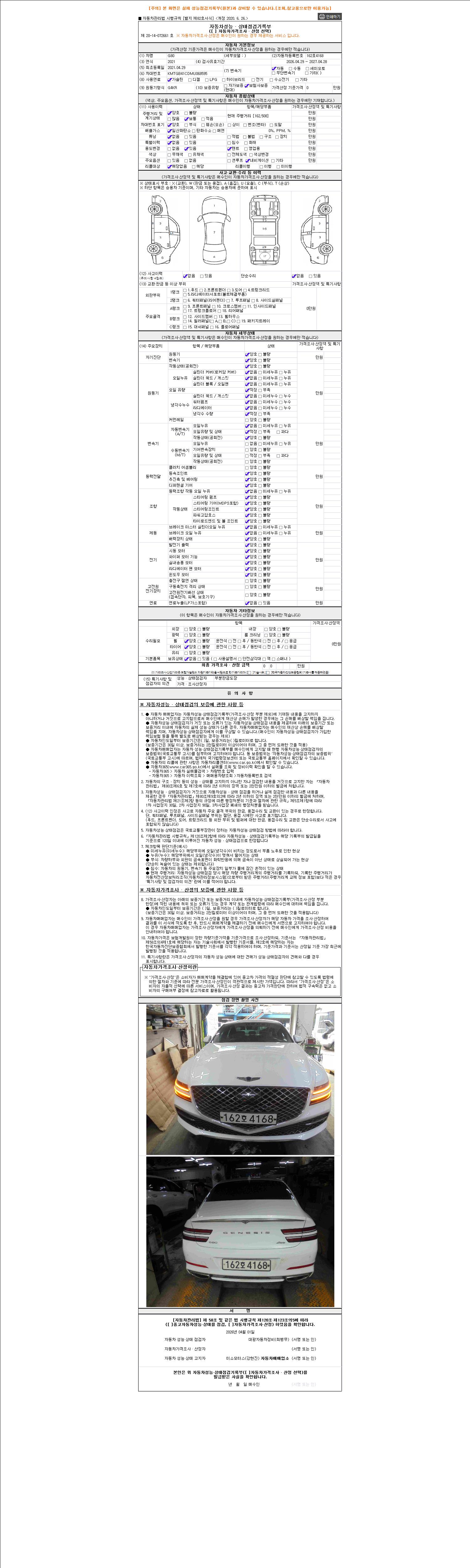 자동차관리법 시행규칙 제120조의 규정에 따라 별지 제 82호서식 《중고자동차 성능, 상태점검 기록부》를 발행한 성능, 상태점검자 및 매매자는 아래의 보증기간 또는 보증거리 이내의 중고자동차, 성능점검 기록부에 기재된 내용과 자동차의 실제 성능, 상태가 다른 경우 계약 또는 관계법령에 따라 매수인에 대하여 책임을 집니다.