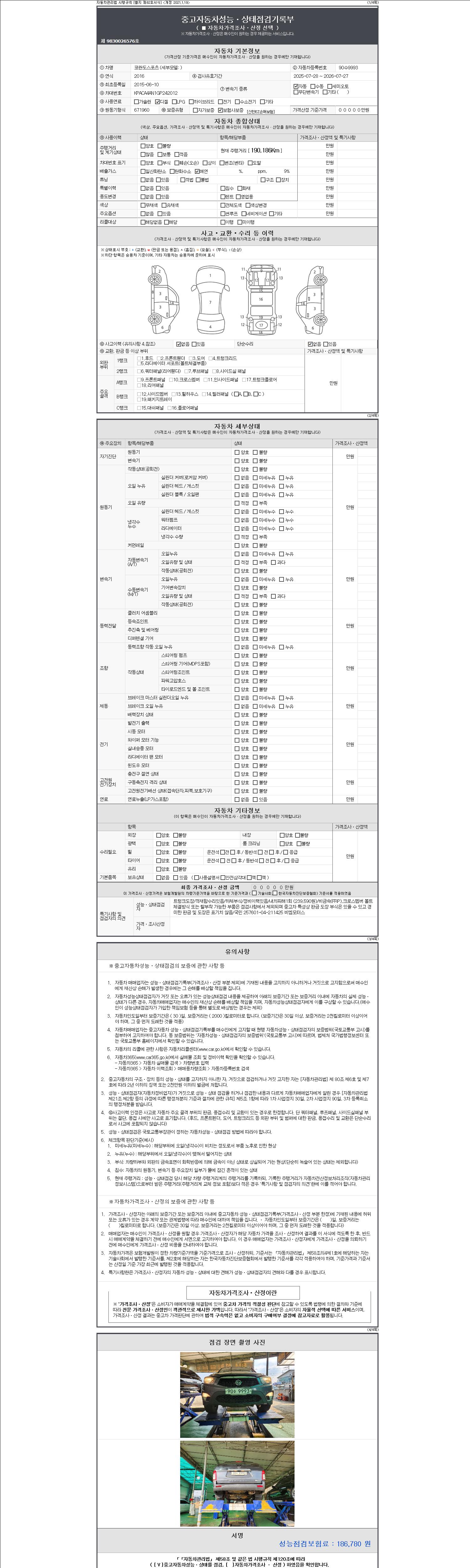 | 주행거리 | 190,186 km | 차량번호 | 90수9993 | 사고유무 | 성능기록부 참조 | 제시번호 | 제 2147483647 호 |