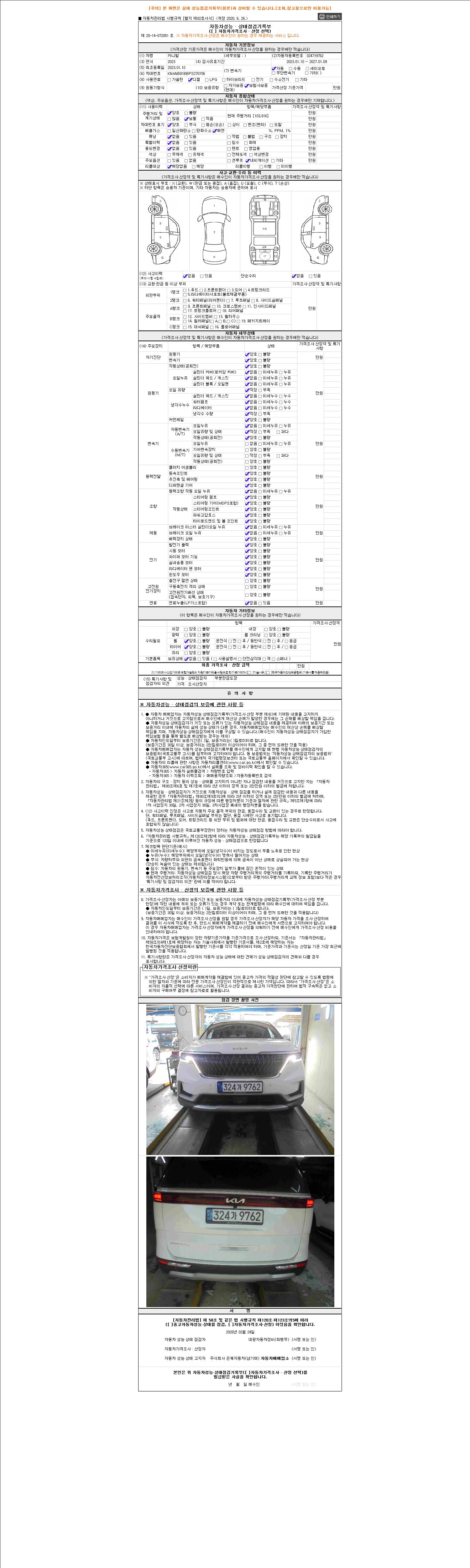 | 주행거리 | 103,817 km | 차량번호 | 324가9762 | 사고유무 | 성능기록부 참조 | 제시번호 | 제 2026020384 호 |