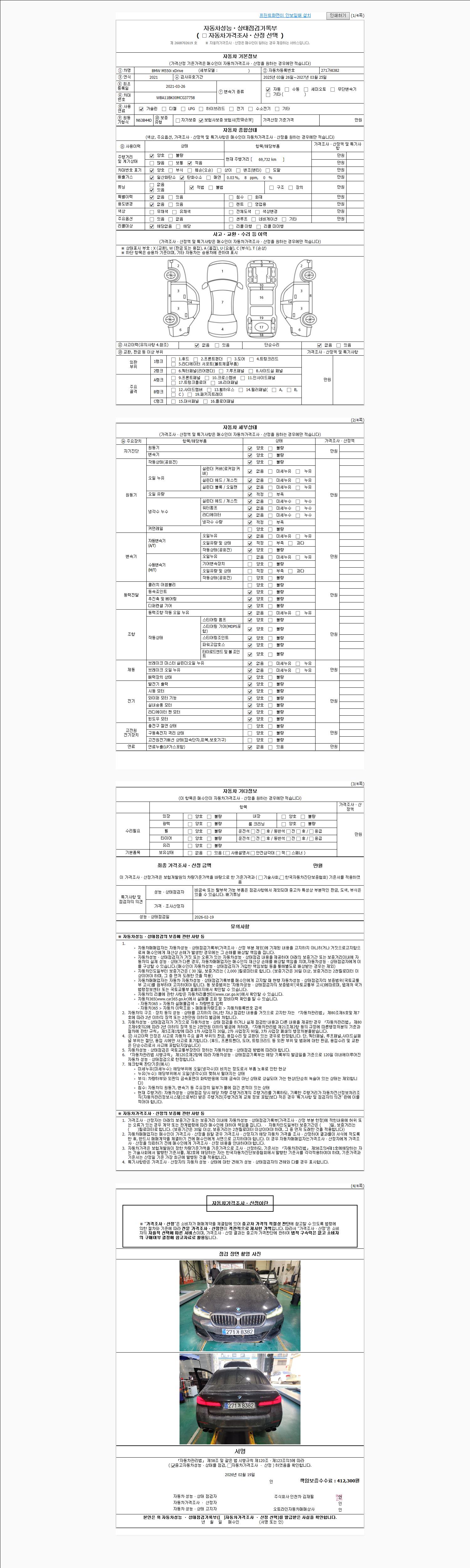 | 주행거리 | 69,732 km | 차량번호 | 271가8382 | 사고유무 | 성능기록부 참조 | 제시번호 | 제 2026008665 호 |
