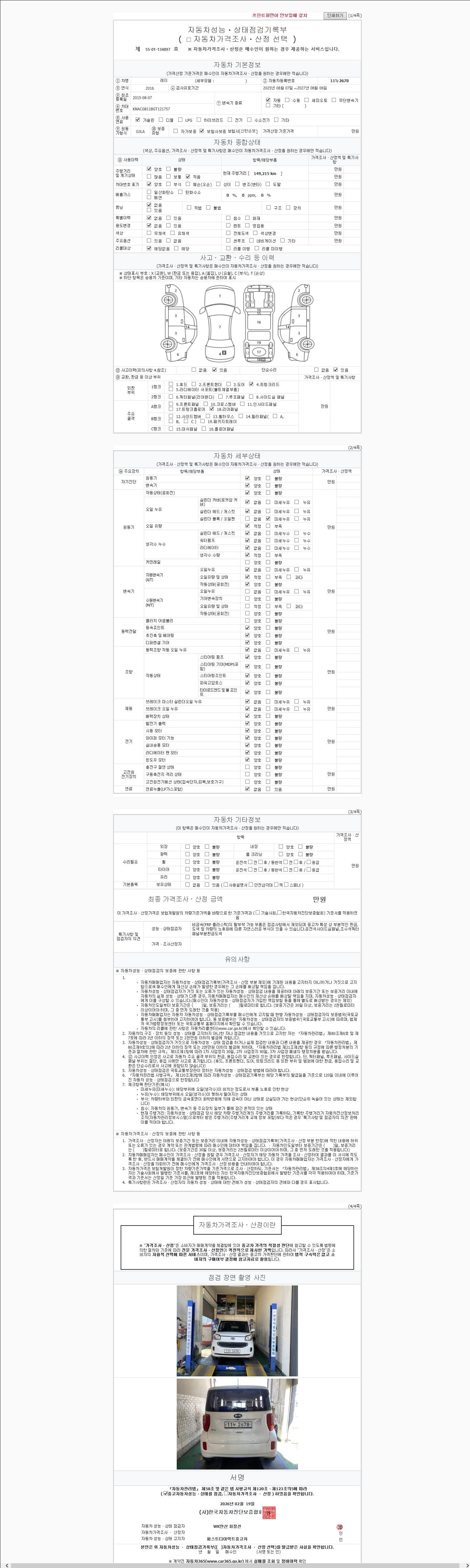 | 주행거리 | 149,215 km | 차량번호 | 11누2678 | 사고유무 | 성능기록부 참조 | 제시번호 | 제 2147483647 호 |