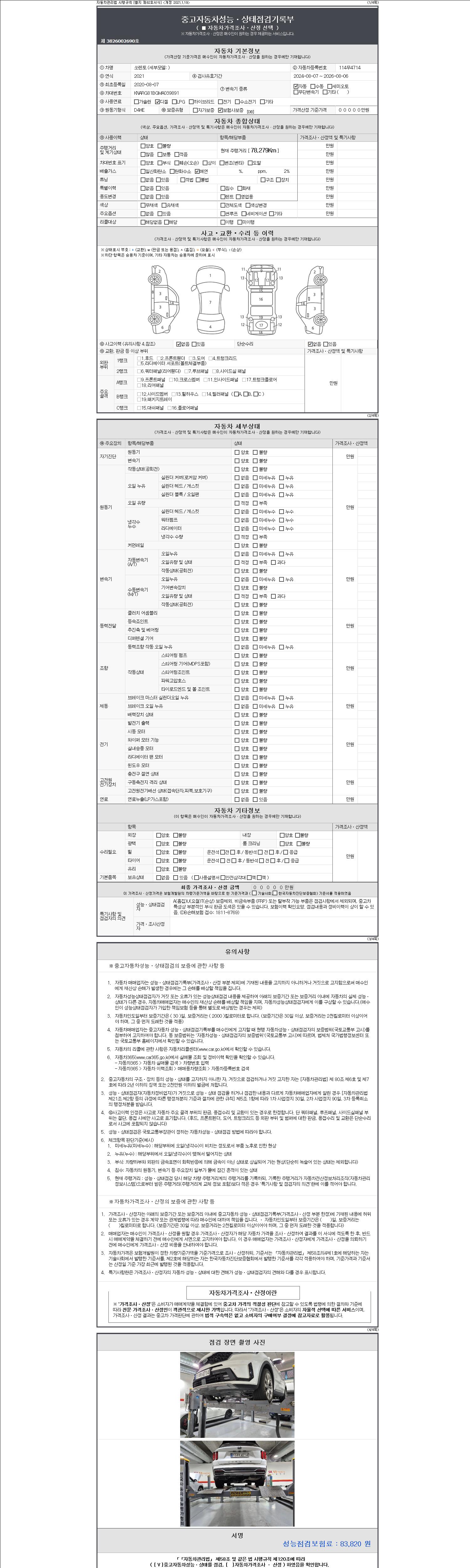| 주행거리 | 78,279 km | 차량번호 | 114무4714 | 사고유무 | 성능기록부 참조 | 제시번호 | 제 2147483647 호 |