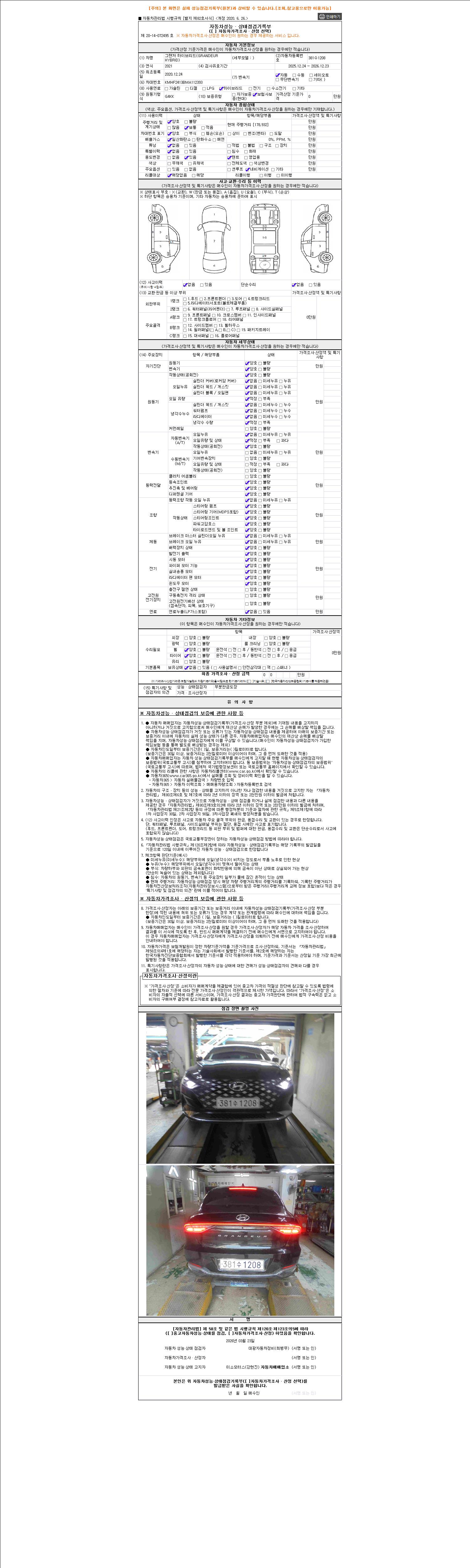 자동차관리법 시행규칙 제120조의 규정에 따라 별지 제 82호서식 《중고자동차 성능, 상태점검 기록부》를 발행한 성능, 상태점검자 및 매매자는 아래의 보증기간 또는 보증거리 이내의 중고자동차, 성능점검 기록부에 기재된 내용과 자동차의 실제 성능, 상태가 다른 경우 계약 또는 관계법령에 따라 매수인에 대하여 책임을 집니다.