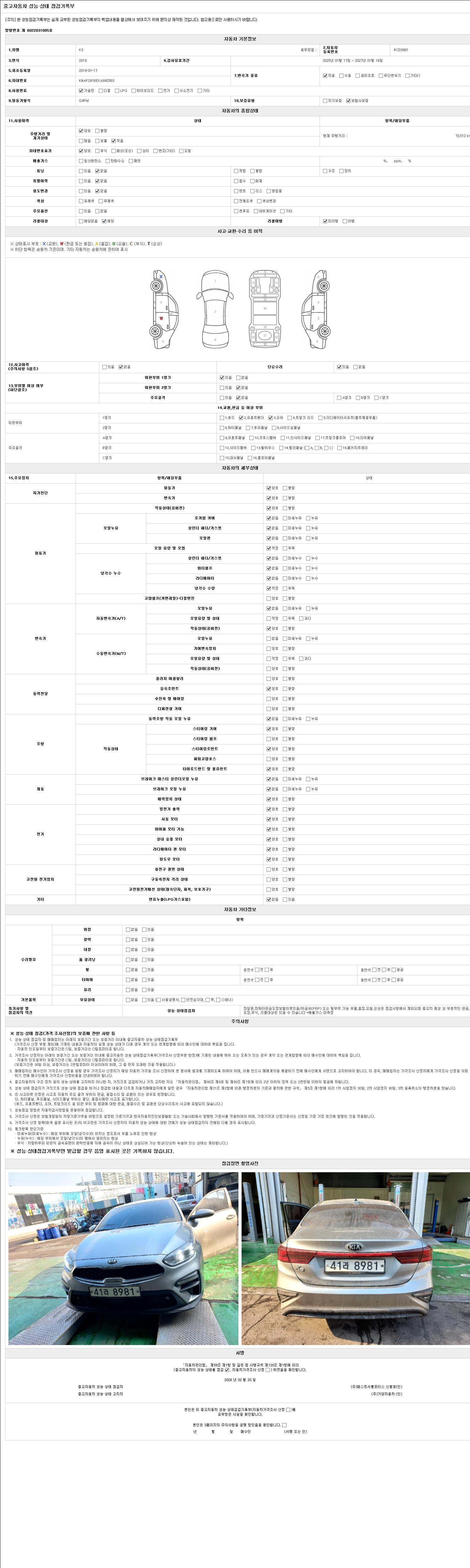| 주행거리 | 70,512 km | 차량번호 | 41라8981 | 사고유무 | 성능기록부 참조 | 제시번호 | 제 2026005229 호 |