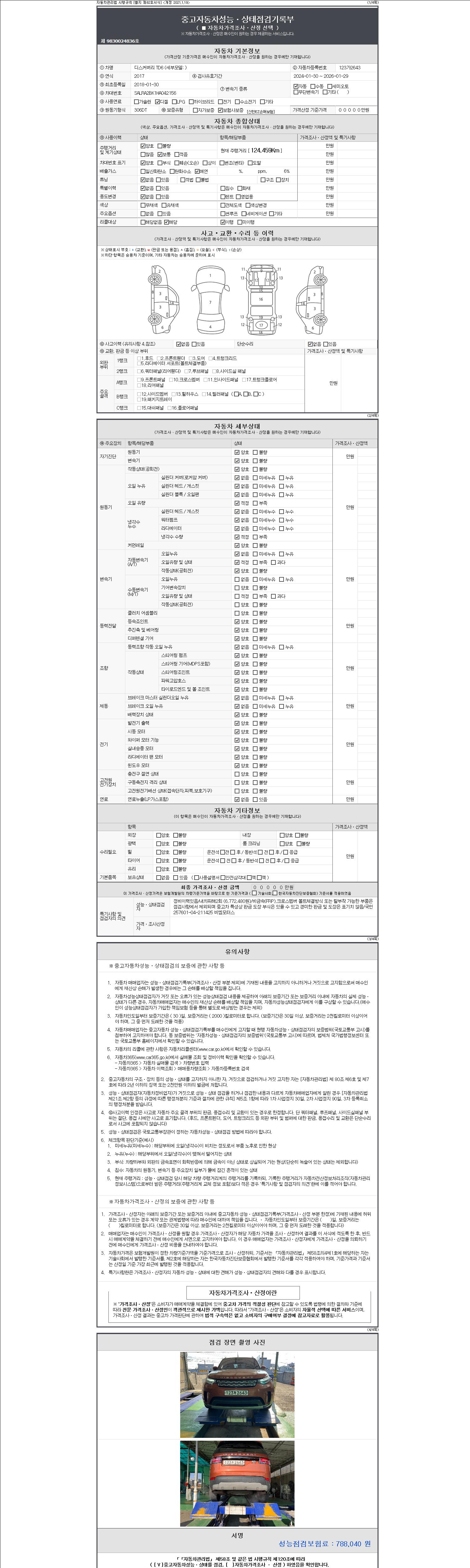 | 주행거리 | 124,459 km | 차량번호 | 123가2643 | 사고유무 | 성능기록부 참조 | 제시번호 | 제 2147483647 호 |