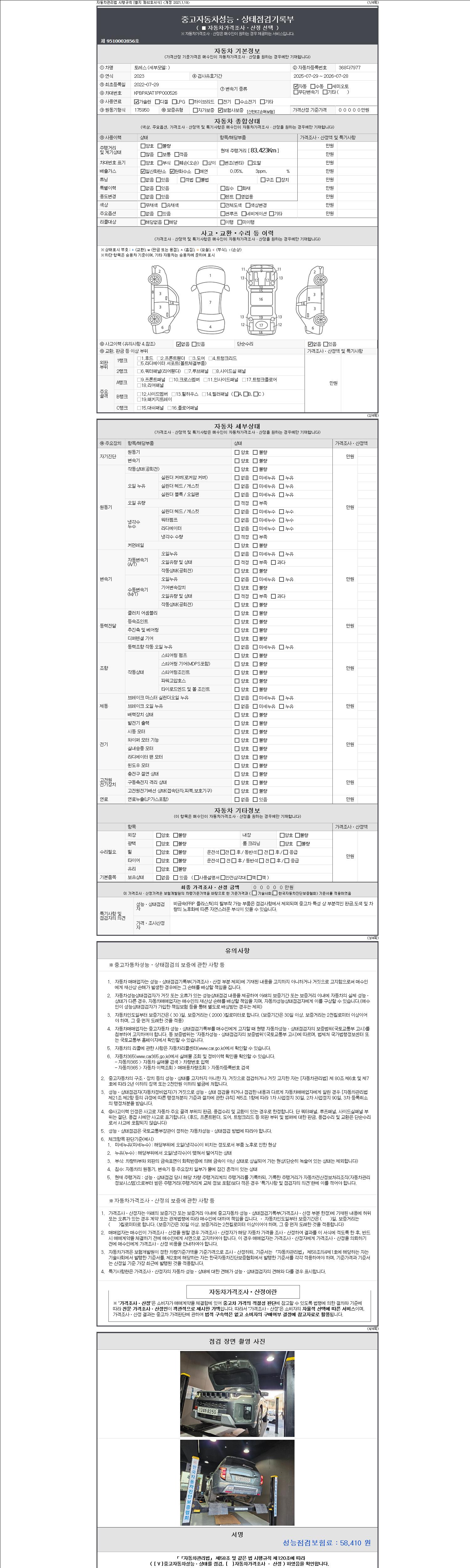 자동차관리법 시행규칙 제120조의 규정에 따라 별지 제 82호서식 《중고자동차 성능, 상태점검 기록부》를 발행한 성능, 상태점검자 및 매매자는 아래의 보증기간 또는 보증거리 이내의 중고자동차, 성능점검 기록부에 기재된 내용과 자동차의 실제 성능, 상태가 다른 경우 계약 또는 관계법령에 따라 매수인에 대하여 책임을 집니다.