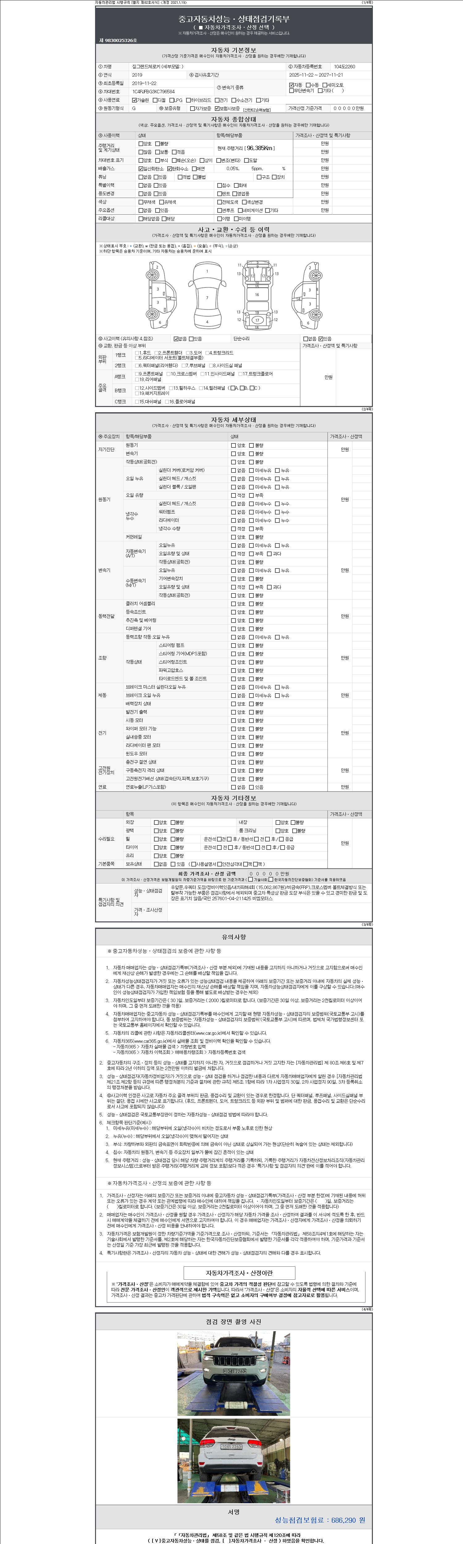 | 주행거리 | 96,385 km | 차량번호 | 104도2260 | 사고유무 | 성능기록부 참조 | 제시번호 | 제 2147483647 호 |