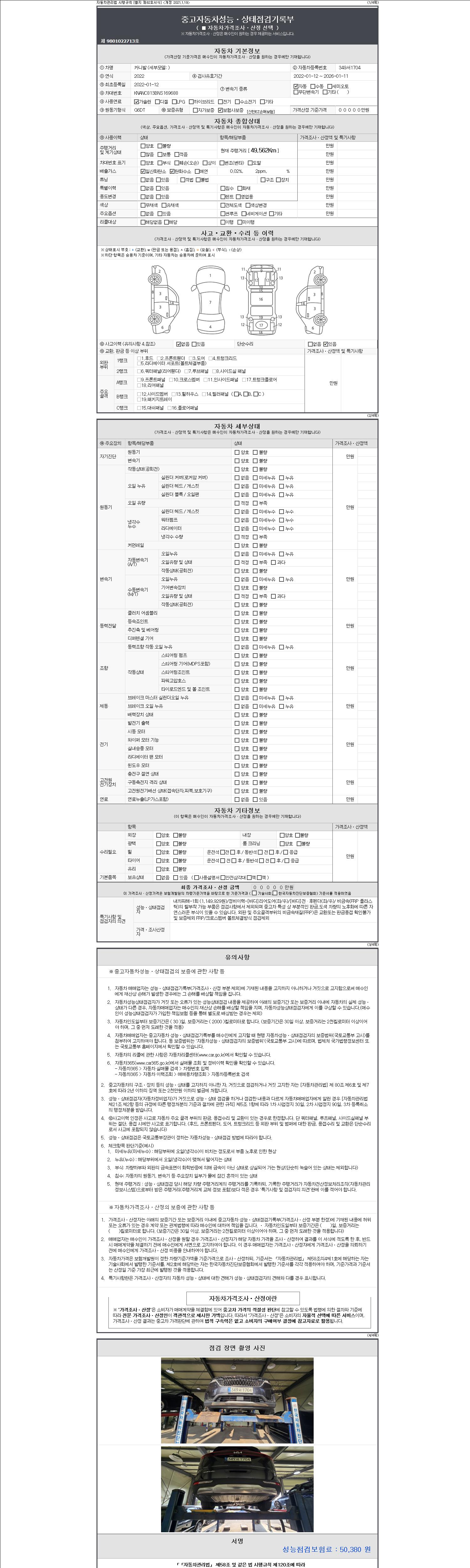 자동차관리법 시행규칙 제120조의 규정에 따라 별지 제 82호서식 《중고자동차 성능, 상태점검 기록부》를 발행한 성능, 상태점검자 및 매매자는 아래의 보증기간 또는 보증거리 이내의 중고자동차, 성능점검 기록부에 기재된 내용과 자동차의 실제 성능, 상태가 다른 경우 계약 또는 관계법령에 따라 매수인에 대하여 책임을 집니다.