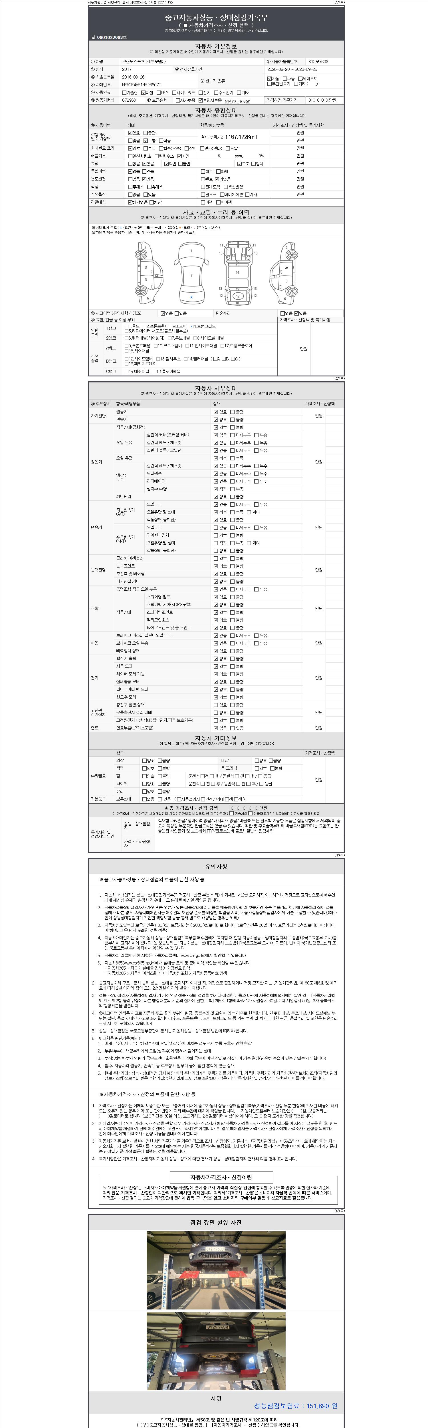 자동차관리법 시행규칙 제120조의 규정에 따라 별지 제 82호서식 《중고자동차 성능, 상태점검 기록부》를 발행한 성능, 상태점검자 및 매매자는 아래의 보증기간 또는 보증거리 이내의 중고자동차, 성능점검 기록부에 기재된 내용과 자동차의 실제 성능, 상태가 다른 경우 계약 또는 관계법령에 따라 매수인에 대하여 책임을 집니다.