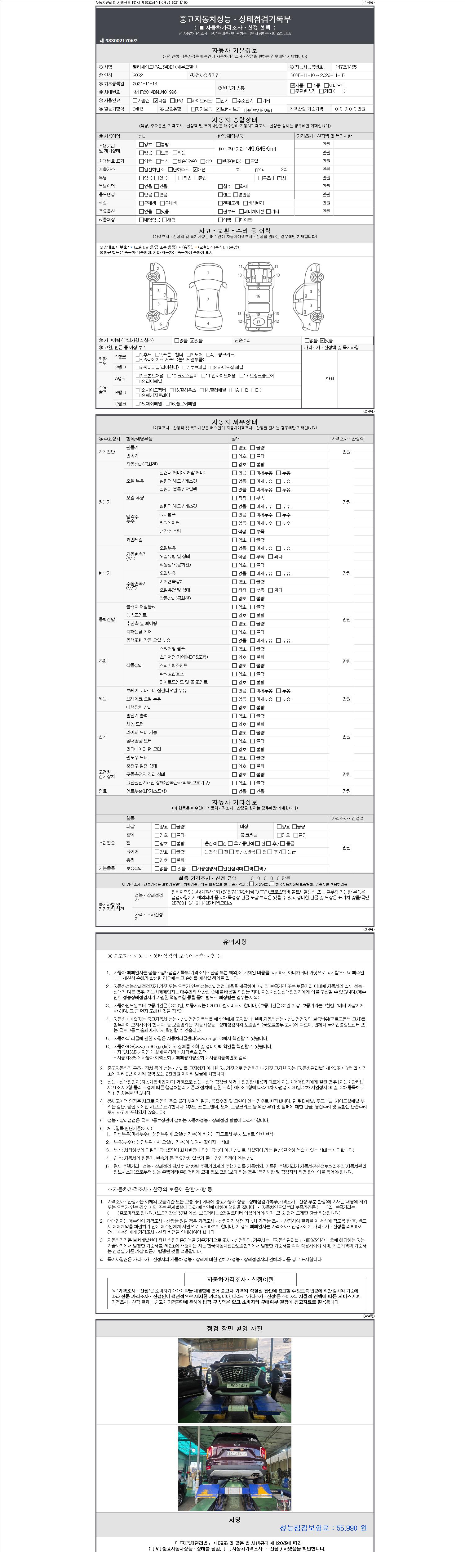 -중고자동차 매매업자를 통해 차량을 구입하실 경우 반드시 "중고자동차 성능, 상태점검 기록부"를 교뷰 받으셔야 하며, 매매업자는 반드시 의무 교부 하여야 압니다.