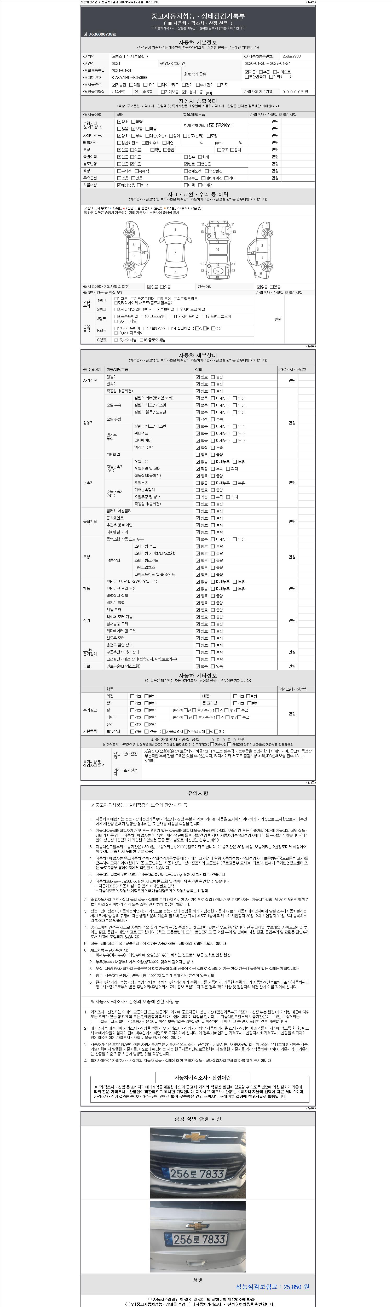 | 주행거리 | 55,522 km | 차량번호 | 256로7833 | 사고유무 | 성능기록부 참조 | 제시번호 | 제 2147483647 호 |