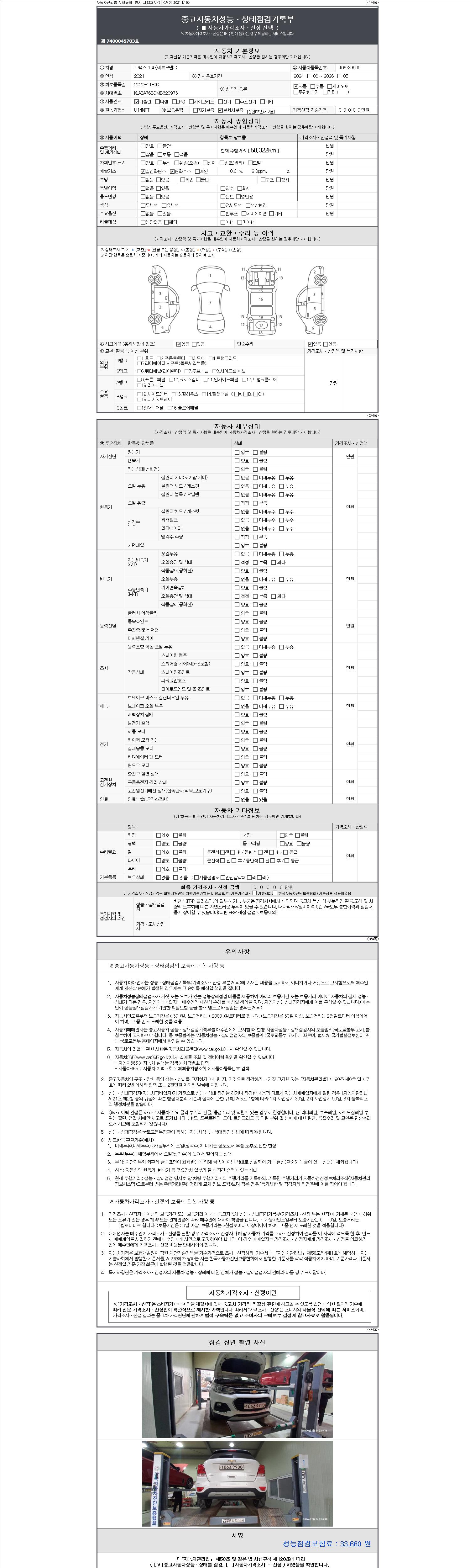 자동차관리법 시행규칙 제120조의 규정에 따라 별지 제 82호서식 《중고자동차 성능, 상태점검 기록부》를 발행한 성능, 상태점검자 및 매매자는 아래의 보증기간 또는 보증거리 이내의 중고자동차, 성능점검 기록부에 기재된 내용과 자동차의 실제 성능, 상태가 다른 경우 계약 또는 관계법령에 따라 매수인에 대하여 책임을 집니다.