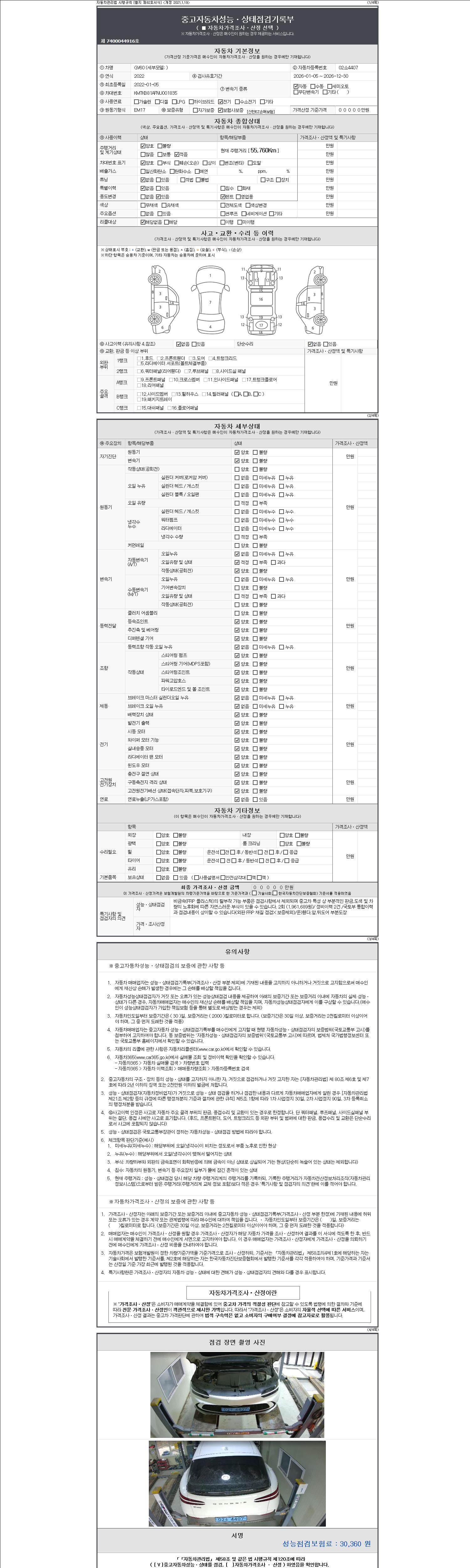 자동차관리법 시행규칙 제120조의 규정에 따라 별지 제 82호서식 《중고자동차 성능, 상태점검 기록부》를 발행한 성능, 상태점검자 및 매매자는 아래의 보증기간 또는 보증거리 이내의 중고자동차, 성능점검 기록부에 기재된 내용과 자동차의 실제 성능, 상태가 다른 경우 계약 또는 관계법령에 따라 매수인에 대하여 책임을 집니다.